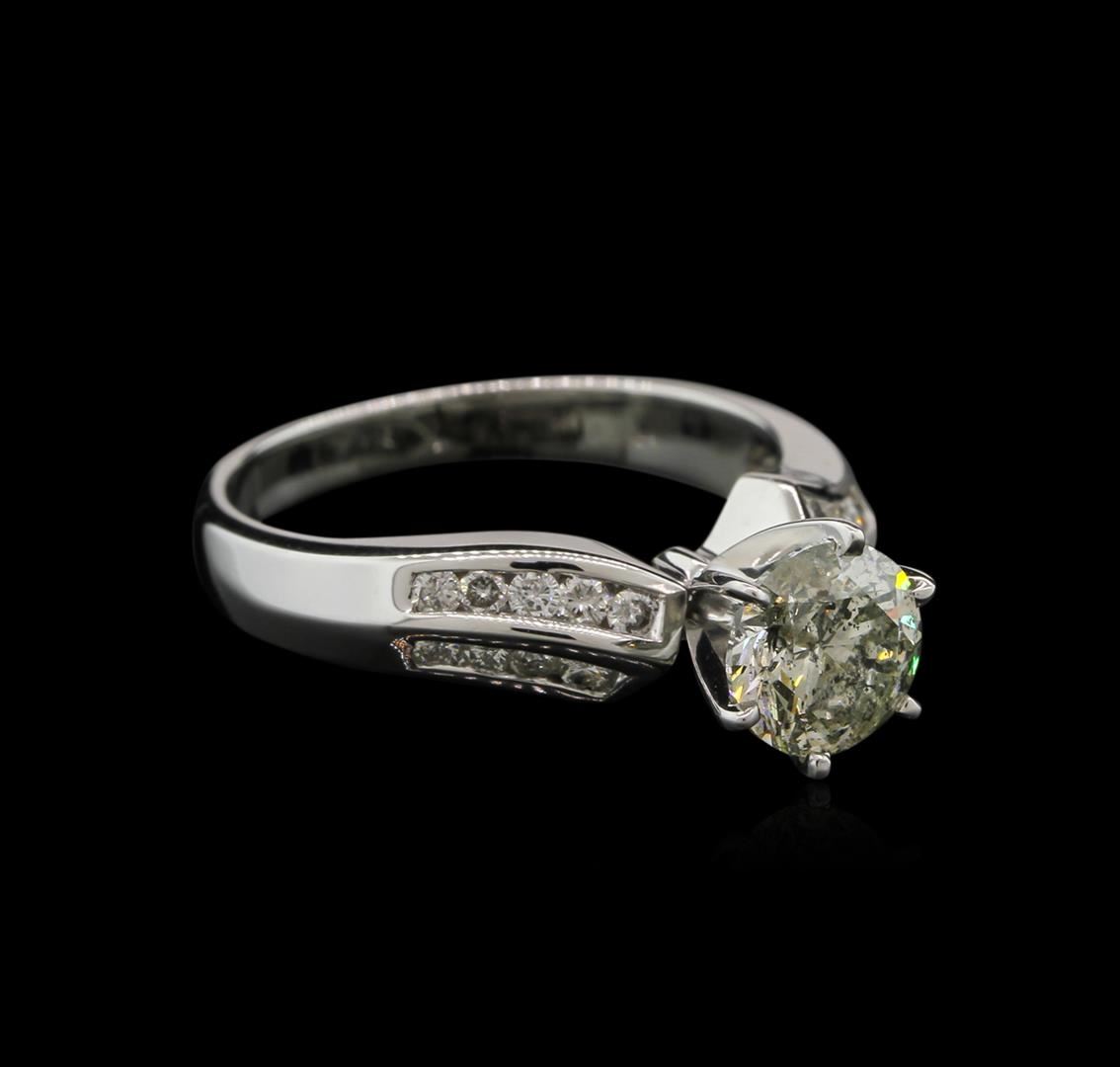 One electronically tested 14KT white gold ladies cast diamond engagement ring with a bright polish finish. Identified with markings of "14K". Condition is new. Containing: One prong set round brilliant cut diamond, measuring 6.80 - 6.80 x 4.08mm (depth est.) approximate weight of 1.26ct. Clarity: I-2. Color: I, Cut is Good. Eighteen channel set round brilliant cut diamonds, measuring 1.50 - 1.50 x 0.90mm (depth est.) approximate total weight of 18 Stones = 0.30ct. Clarity: SI-2. Color: I - J, Cut is Good. Diamonds are graded in the mounting, unless otherwise stated. Total Weight of Diamonds 1.56ct. Total Weight of Engagement Ring 4.10 grams. GGL Appraised at $6,475.00.