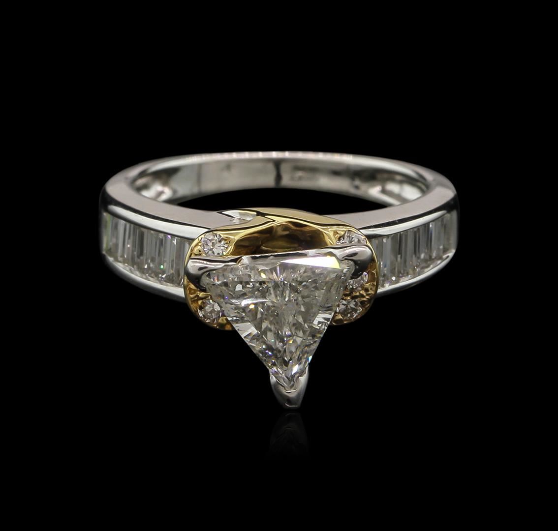 One electronically tested 14KT white and yellow gold ladies cast diamond engagement ring with a bright polish finish. Identified with markings of "14K". Condition is new. Containing: One prong set triangle brilliant cut diamond, measuring 7.50 x 8.00 x 4.96mm (depth est.) approximate weight of 1.00ct. Clarity: I-1. Color: I, Cut is Good. Twelve channel set baguette cut diamonds, measuring from 2.00 x 1.50 x 1.28mm (depth est.) to 2.60 x 1.50 x 1.28mm (depth est.) approximate total weight of 12 Stones = 0.49ct. Clarity: VS-2 to SI-1. Color: H - I, Cut is Good. Six prong set round brilliant cut diamonds, measuring 1.50 - 1.50 x 0.90mm (depth est.) approximate total weight of 6 Stones = 0.07ct. Clarity: SI-1. Color: K - L, Cut is Good. Diamonds are graded in the mounting, unless otherwise stated. Total Weight of Diamonds 1.56ct. Total Weight of Engagement Ring 4.40 grams. GGL Appraised at $7,255.00.