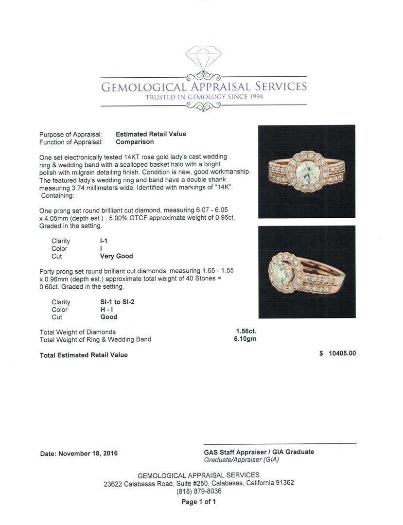 One set electronically tested 14KT rose gold lady's cast wedding ring & wedding band with a scalloped basket halo with a bright polish with milgrain detailing finish. The featured lady's wedding ring and band have a double shank measuring 3.74 millimeters wide. Identified with markings of '14K'. Condition is new, good workmanship. Containing: One prong set round brilliant cut diamond, measuring 6.07 - 6.05 x 4.05mm (depth est.) , 5.00.%. GTCF approximate weight of 0.96ct. Graded in the setting. Clarity I-1. Color: I Cut Very Good Forty prong set round brilliant cut diamonds, measuring 1.65 - 1.55 x 0.96mm (depth est.) approximate total weight of 40 Stones = 0.60ct. Graded in the setting. Clarity SI-1 to SI-2. Color: H - I Cut Good. Total Weight of Diamonds 1.56ct.. Total Weight of Ring & Wedding Band 6.10gm. GAS Appraised at $10,405.00.