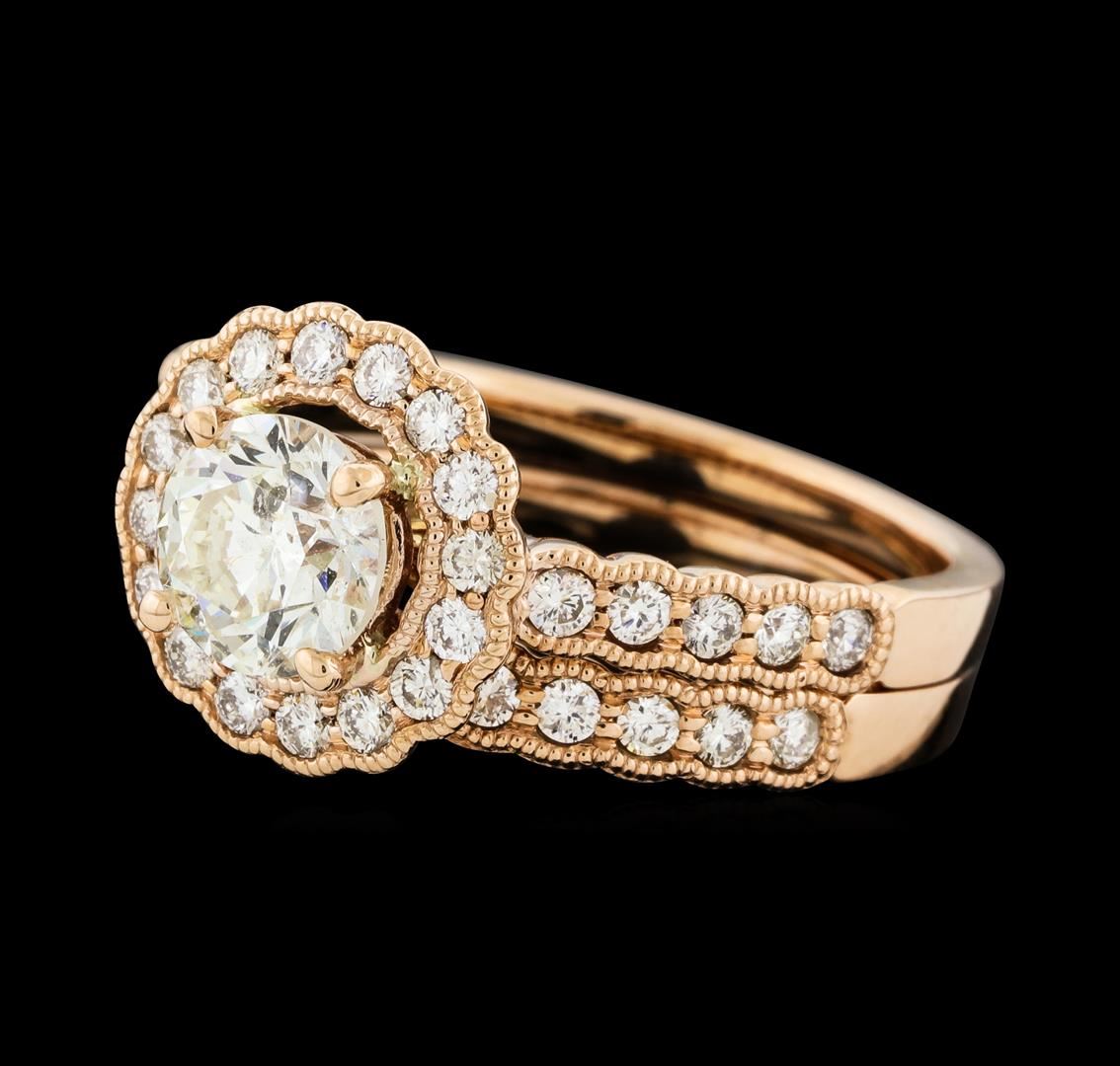 One set electronically tested 14KT rose gold lady's cast wedding ring & wedding band with a scalloped basket halo with a bright polish with milgrain detailing finish. The featured lady's wedding ring and band have a double shank measuring 3.74 millimeters wide. Identified with markings of '14K'. Condition is new, good workmanship. Containing: One prong set round brilliant cut diamond, measuring 6.07 - 6.05 x 4.05mm (depth est.) , 5.00.%. GTCF approximate weight of 0.96ct. Graded in the setting. Clarity I-1. Color: I Cut Very Good Forty prong set round brilliant cut diamonds, measuring 1.65 - 1.55 x 0.96mm (depth est.) approximate total weight of 40 Stones = 0.60ct. Graded in the setting. Clarity SI-1 to SI-2. Color: H - I Cut Good. Total Weight of Diamonds 1.56ct.. Total Weight of Ring & Wedding Band 6.10gm. GAS Appraised at $10,405.00.
