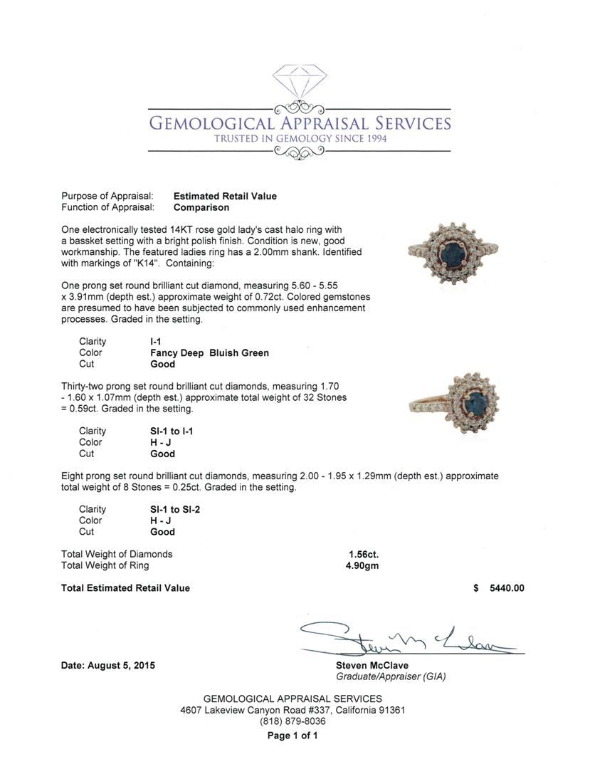 One electronically tested 14KT rose gold lady's cast halo ring with a basket setting with a bright polish finish. The featured ladies ring has a 2.00mm shank. Identified with markings of "K14". Condition is new, good workmanship. Containing: One prong set round brilliant cut diamond, measuring 5.60 - 5.55 x 3.91mm (depth est.) approximate weight of 0.72ct. Colored gemstones are presumed to have been subjected to commonly used enhancement processes. Graded in the setting. Clarity: I-1 Cut Good Thirty-Two prong set round brilliant cut diamonds, measuring 1.70 - 1.60 x 1.07mm (depth est.) approximate. Total Weight of 32 Stones = 0.59ct. Graded in the setting. Clarity: SI-1 to I-1. Color: H - Good Eight prong set round brilliant cut diamonds, measuring 2.00 - 1.95 x 1.29mm (depth est.) approximate. Total Weight of 8 Stones = 0.25ct. Graded in the setting. Clarity: SI-1 to SI-2. Color: H - Good. Total Weight of Diamonds 1.56ct. Total Weight of Ring 4.90gm. GAS Appraised.