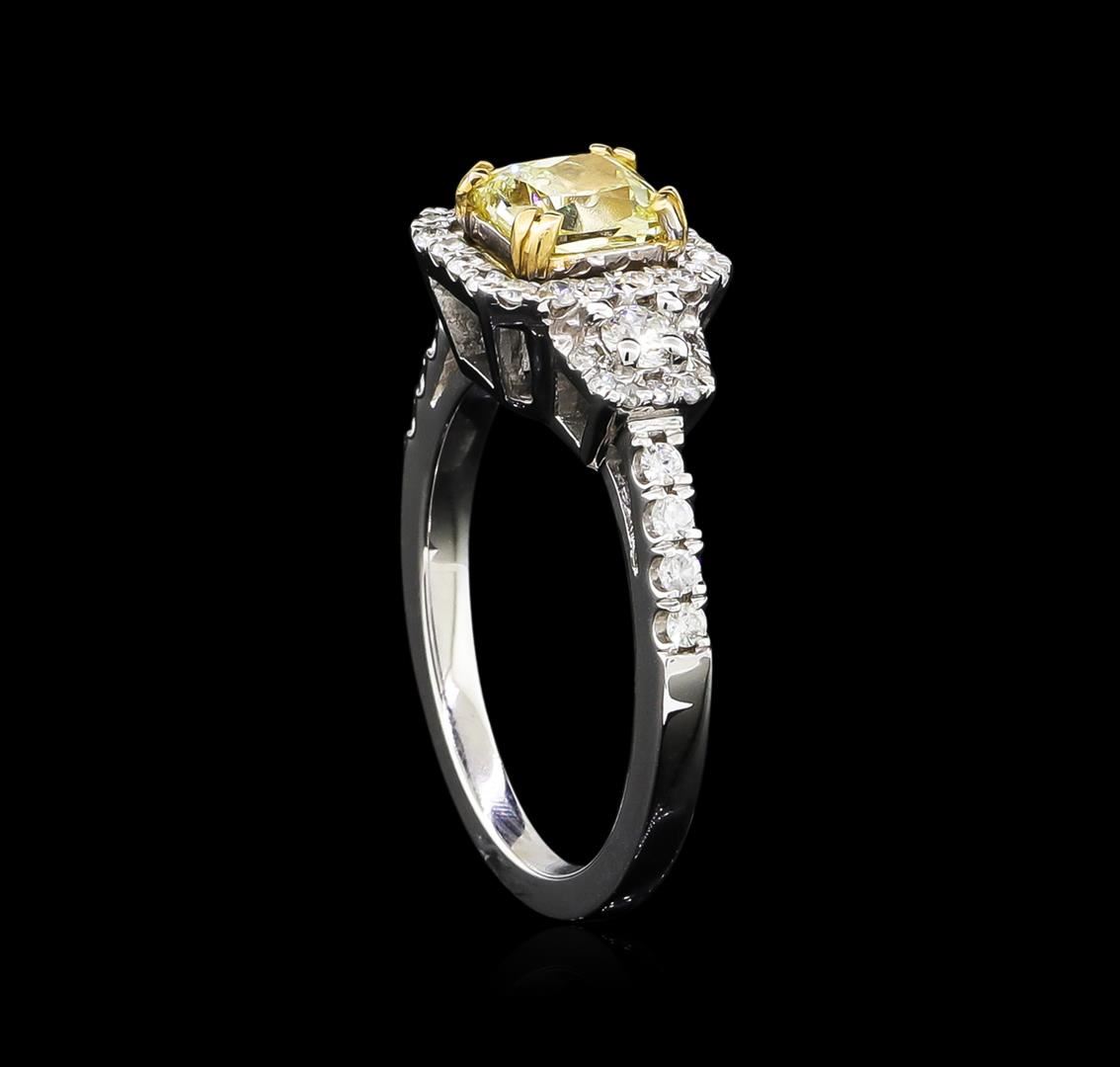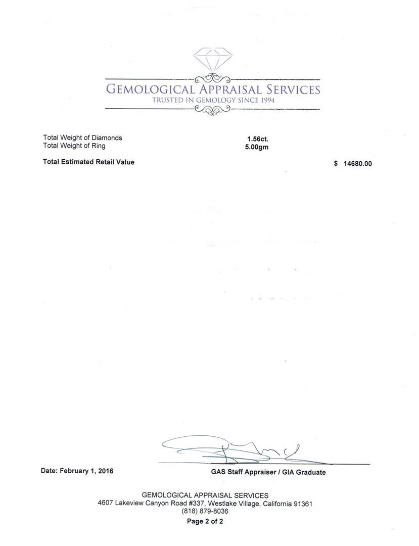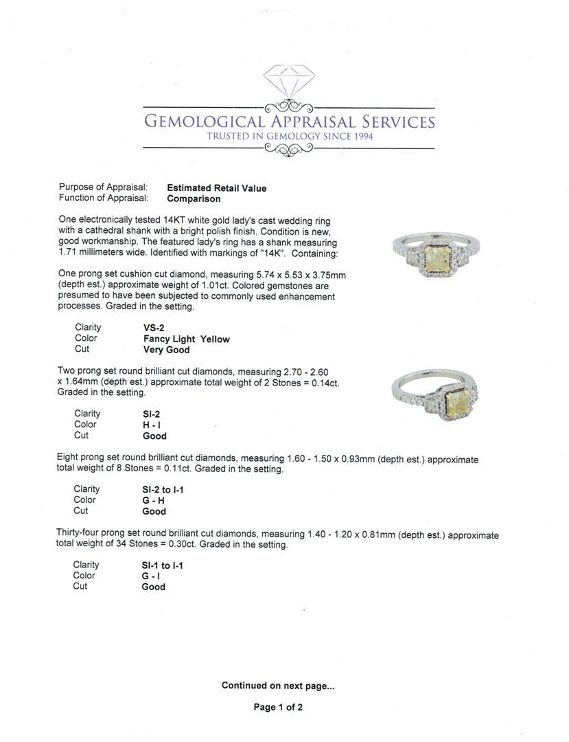 One electronically tested 14KT white gold lady's cast wedding ring with a cathedral shank with a bright polish finish. The featured lady's ring has a shank measuring 1.71 millimeters wide. Identified with markings of "14K". Condition is new, good workmanship. Containing: One prong set cushion cut diamond, measuring 5.74 x 5.53 x 3.75mm (depth est.) approximate weight of 1.01ct. Colored gemstones are presumed to have been subjected to commonly used enhancement processes. Graded in the setting. Clarity: VS-2 Cut Very Good Two prong set round brilliant cut diamonds, measuring 2.70 - 2.60 x 1.64mm (depth est.) approximate total weight of 2 Stones = 0.14ct. Graded in the setting. Clarity: SI-2. Color: H - I. Cut Good Eight prong set round brilliant cut diamonds, measuring 1.60 - 1.50 x 0.93mm (depth est.) approximate total weight of 8 Stones = 0.11ct. Graded in the setting. Clarity: SI-2 to I-1. Color: G - Good Thirty-Four prong set round brilliant cut diamonds, measuring 1.40 - 1.20 x 0.81mm (depth est.) approximate total weight of 34 Stones = 0.30ct. Graded in the setting. Clarity: SI-1 to I-1. Color: G - I. Cut Good. Total Weight of Diamonds 1.56ct. Total Weight of Ring 5.00gm. GAS Appraised at $14,680.00.
