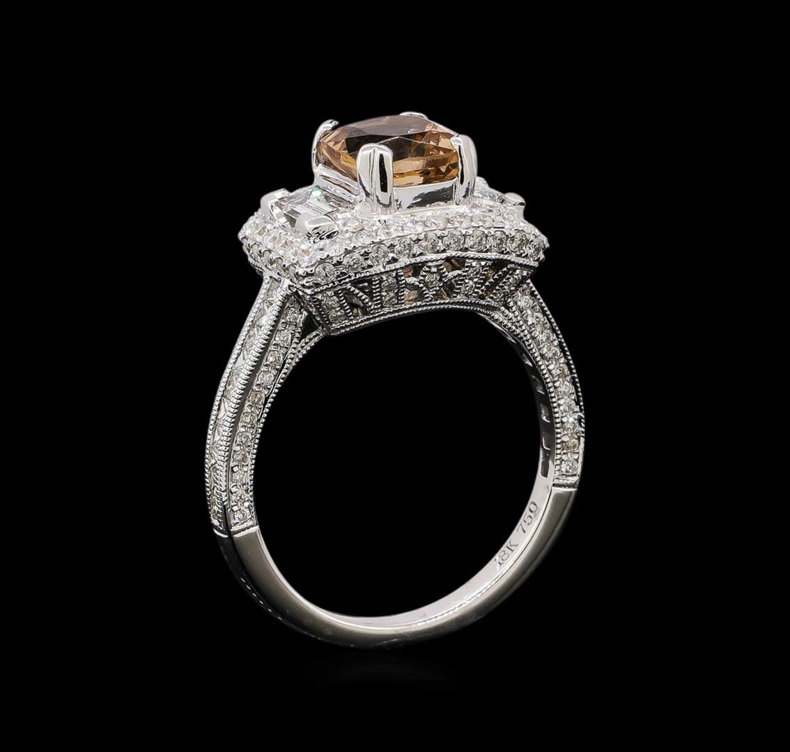 One electronically tested 18KT white gold ladies cast morganite and diamond ring. The featured morganite is set within a stylized diamond bezel supported by an intricate diamond under gallery and diamond set shoulders, completed by a two millimeter wide band. Bright polish finish with milgrain detailing. Identified with markings of '18K 750'. Condition is new, good workmanship. Containing: One prong set square cushion mixed cut natural morganite, measuring 7.00 x 7.00 x 4.55mm, 5%. bulge factor, approximate weight of 1.56ct., clarity is eye clean, type I, light, brownish, reddish orange color, (GIA rO 3/1), cut is good. Transmitting light with no distortion, transparent. Graded in the setting. Two prong set baguette cut diamonds, measuring 4.00 x 2.50 x 1.75mm (depth est.) approximate total weight of 2 Stones = 0.36ct. Graded in the setting. Clarity VS-2 to SI-1. Color: G - H Twenty channel set princess cut diamonds, measuring 1.40 x 1.20 x 0.90mm (depth est.) approximate total weight of 20 Stones = 0.30ct. The color grade reflects the entire range of color for this group. Graded in the setting. Clarity VS-2 to SI-2. Color: F - I One Hundred Thirty prong set round brilliant cut diamonds, measuring 1.20 - 0.80 x 0.60mm (depth est.) approximate total weight of 130 Stones = 0.64ct. The clarity grade reflects the entire range of clarity for this group. Graded in the setting. Clarity SI-1 to I-2. Color: F - H. Total Weight of Colored Stones 1.56ct.. Total Weight of Diamonds 1.30ct.. Total Weight of Ring 6.98gm. AIG Appraised at $6,775.00.