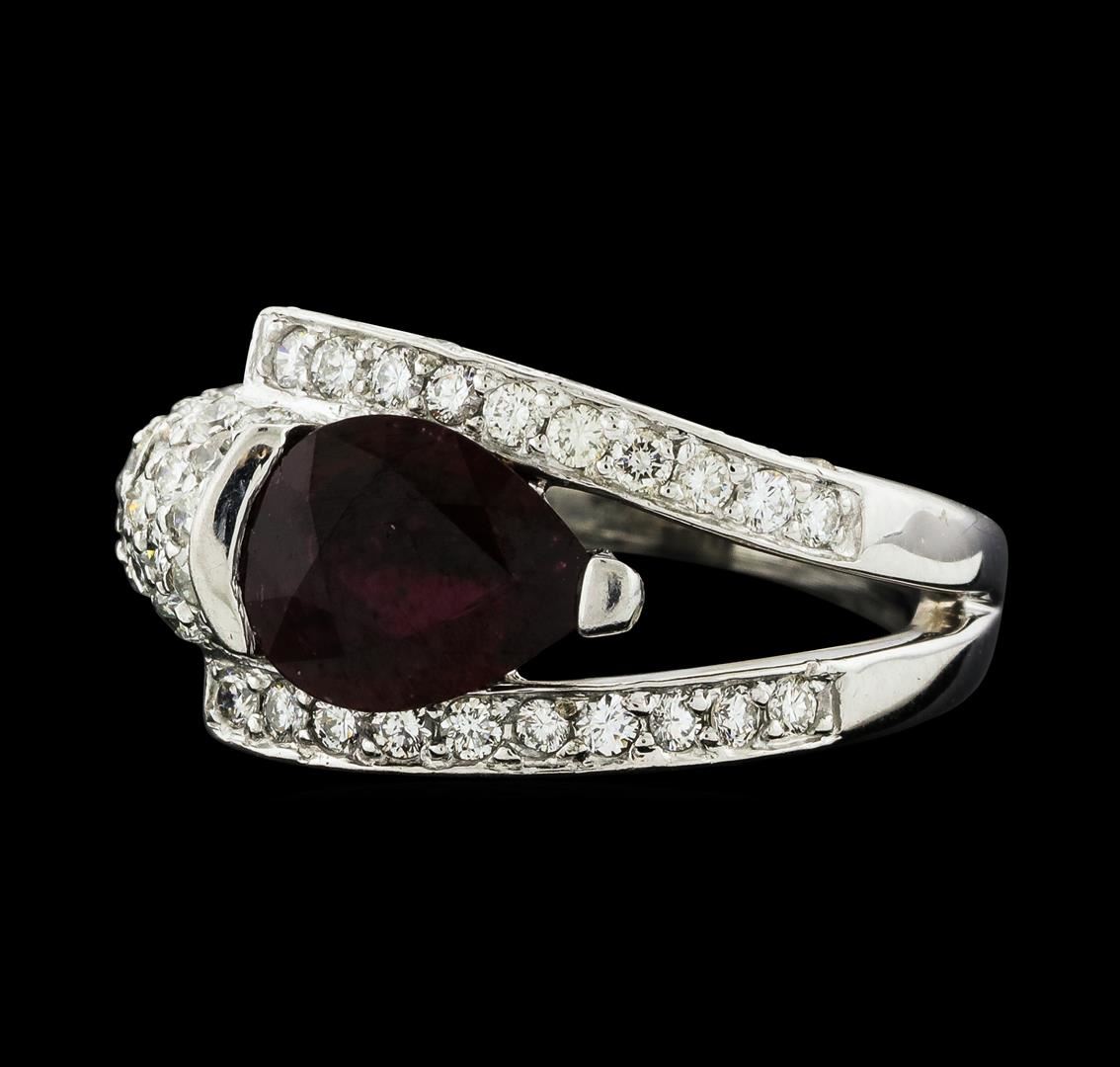 One electronically tested 18KT white gold lady's cast fashion ring with a split shank with a bright polish finish. The featured lady's ring has a shank measuring 2.92 millimeters wide. Identified with markings of '18K'. Condition is new, good workmanship. Containing: One prong set pear modified brilliant cut natural ruby, measuring 9.05 x 7.20 x 3.03mm, (depth est.) approximate weight of 1.56ct., clarity is heavily included, dark, strong, red color, (GIA R 7/5), cut is good. Transmitting light somewhat diffusely, semi-transparent to translucent. Naturally occurring internal & external characteristics are present. Indications of laboratory high temperature heat treatment, with glass & flux additives. Colored gemstones are presumed to have been subjected to commonly used enhancement processes. Graded in the setting. Thirty-Seven prong set round brilliant cut diamonds, measuring 1.90 - 1.75 x 1.13mm (depth est.) approximate total weight of 37 Stones = 0.85ct. Graded in the setting. Clarity VS-2 to SI-1. Color: H - I Cut Good Thirty-Eight prong set round brilliant cut diamonds, measuring 1.70 - 1.50 x 0.99mm (depth est.) approximate total weight of 38 Stones = 0.60ct. Graded in the setting. Clarity VS-2 to SI-1. Color: H - I Cut Good. Total Weight of Colored Stones 1.56ct.. Total Weight of Diamonds 1.45ct.. Total Weight of Ring 6.70gm. GAS Appraised at $5,765.00.