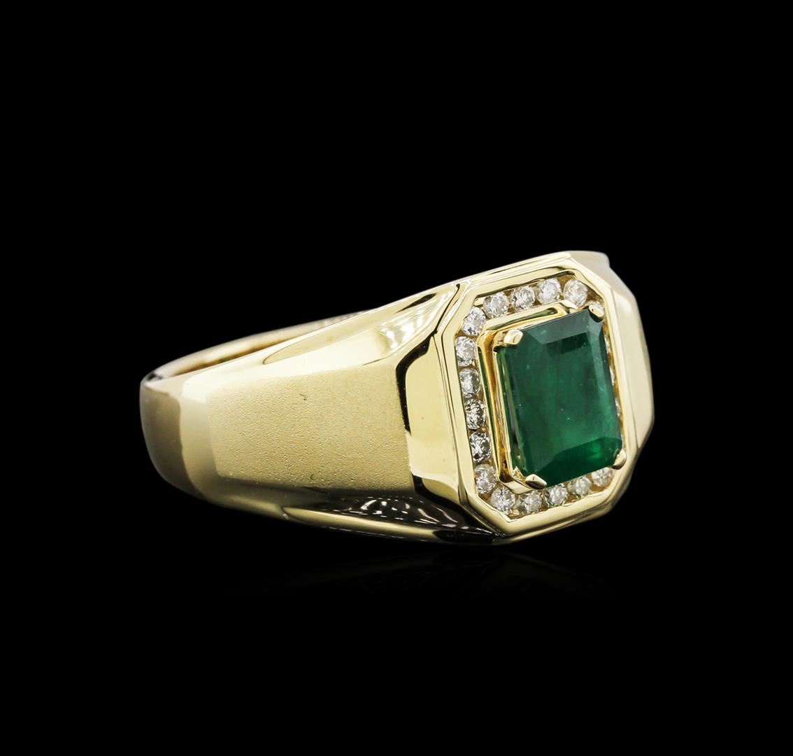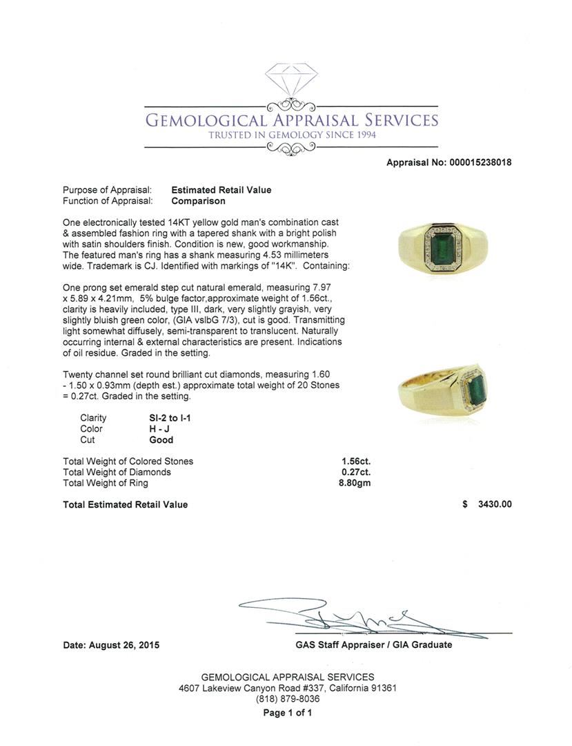 One electronically tested 14KT yellow gold man's combination cast & assembled fashion ring with a tapered shank with a bright polish with satin shoulders finish. The featured man's ring has a shank measuring 4.53 millimeters wide. Trademark is CJ. Identified with markings of "14K". Condition is new, good workmanship. Containing: One prong set emerald step cut natural emerald, measuring 7.97 x 5.89 x 4.21mm, 5% bulge factor, approximate weight of 1.56ct., clarity is heavily included, type III, dark, very slightly grayish, very slightly bluish green color, (GIA vslbG 7/3), cut is good. Transmitting light somewhat diffusely, semi-transparent to translucent. Naturally occurring internal & external characteristics are present. Indications of oil residue. Graded in the setting. Twenty channel set round brilliant cut diamonds, measuring 1.60 - 1.50 x 0.93mm (depth est.) approximate total weight of 20 Stones = 0.27ct. Graded in the setting. Clarity: SI-2 to I-1. Color: H - Good. Total Weight of Colored Stones 1.56ct. Total Weight of Diamonds 0.27ct. Total Weight of Ring 8.80gm. GAS Appraised at $3,430.00.
