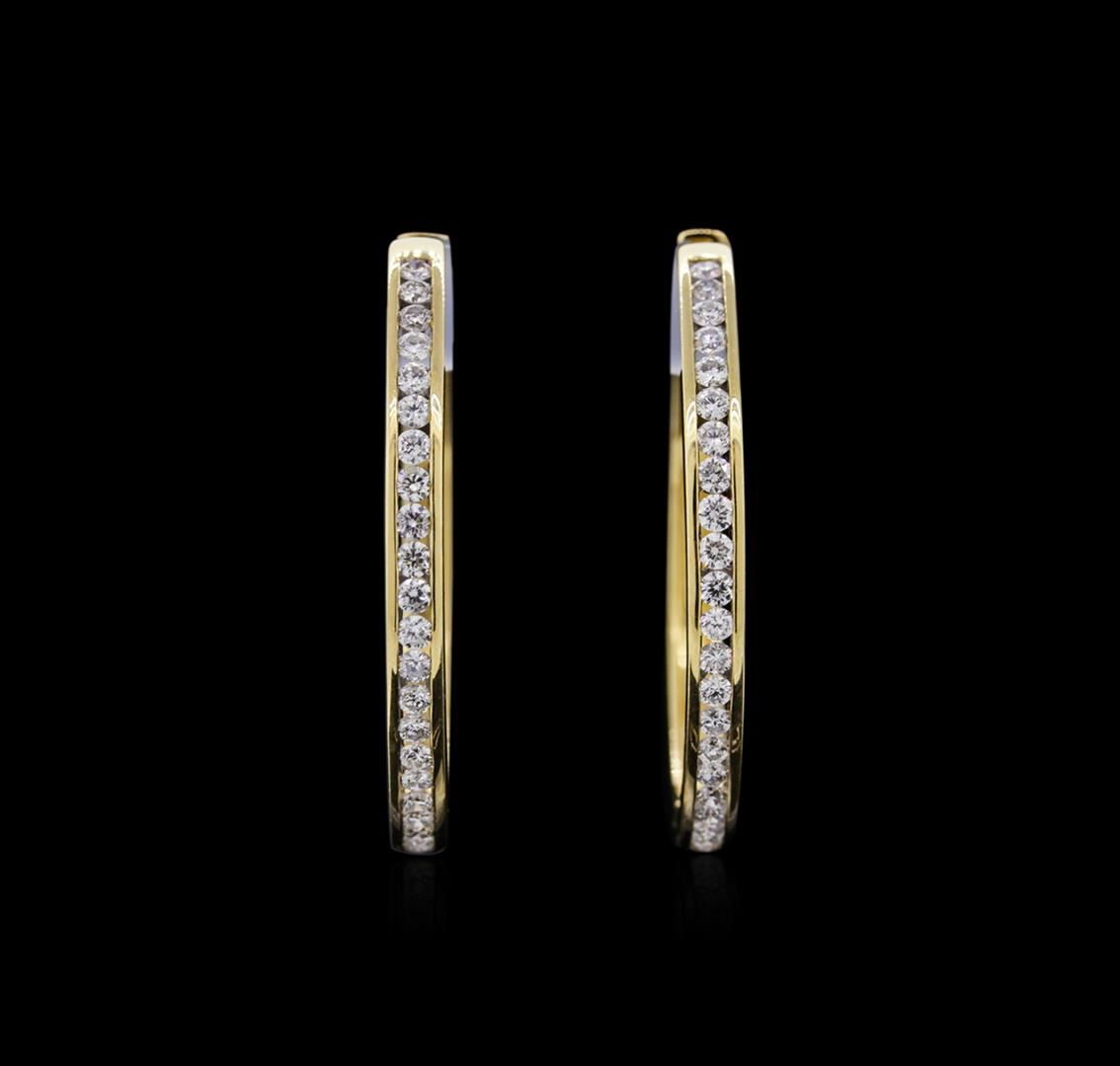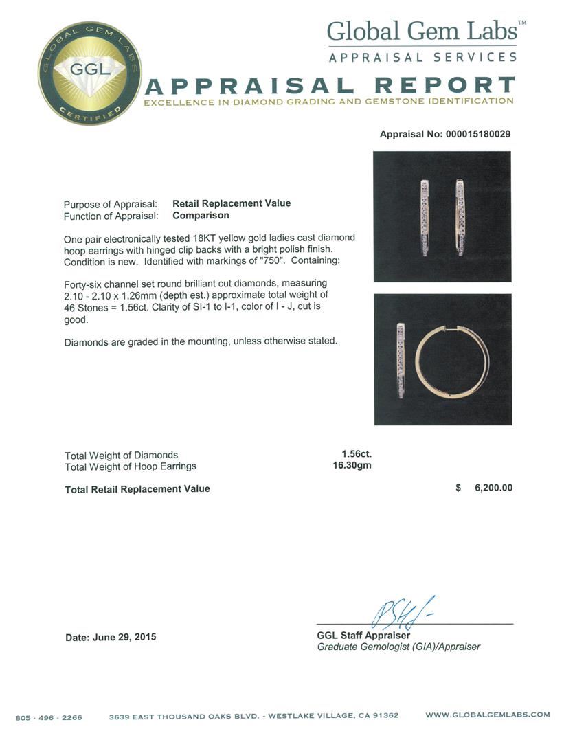 One pair electronically tested 18KT yellow gold ladies cast diamond hoop earrings with hinged clip backs with a bright polish finish. Identified with markings of "750". Condition is new. Containing: Forty-Six channel set round brilliant cut diamonds, measuring 2.10 - 2.10 x 1.26mm (depth est.) approximate total weight of 46 Stones = 1.56ct. Clarity: SI-1 to I-1. Color: I - J, Cut is Good. Diamonds are graded in the mounting, unless otherwise stated. Total Weight of Diamonds 1.56ct. Total Weight of Hoop Earrings 16.30 grams. GGL Appraised at $6,200.00.
