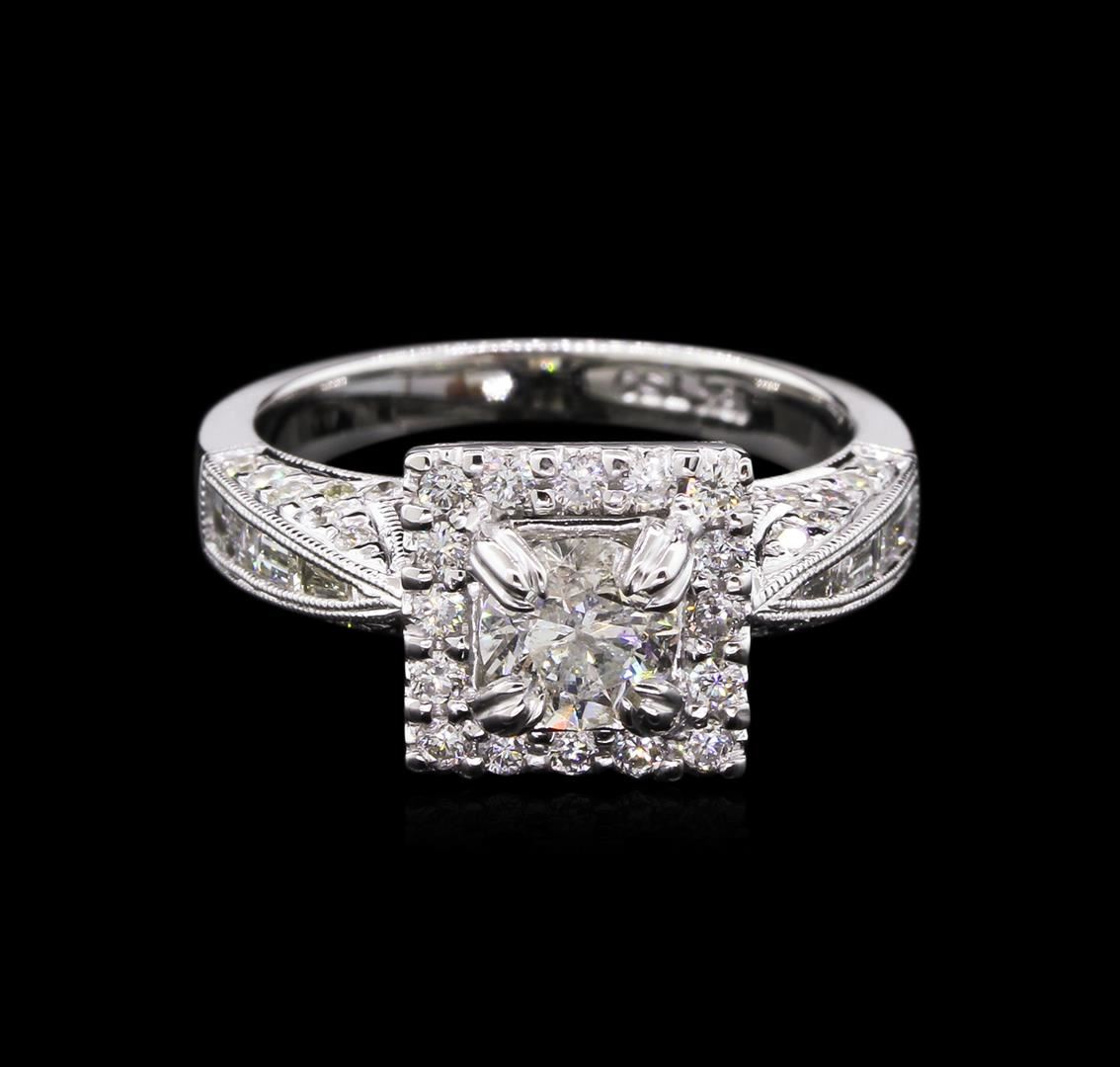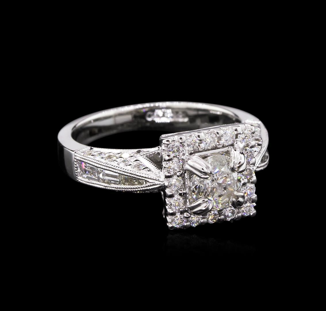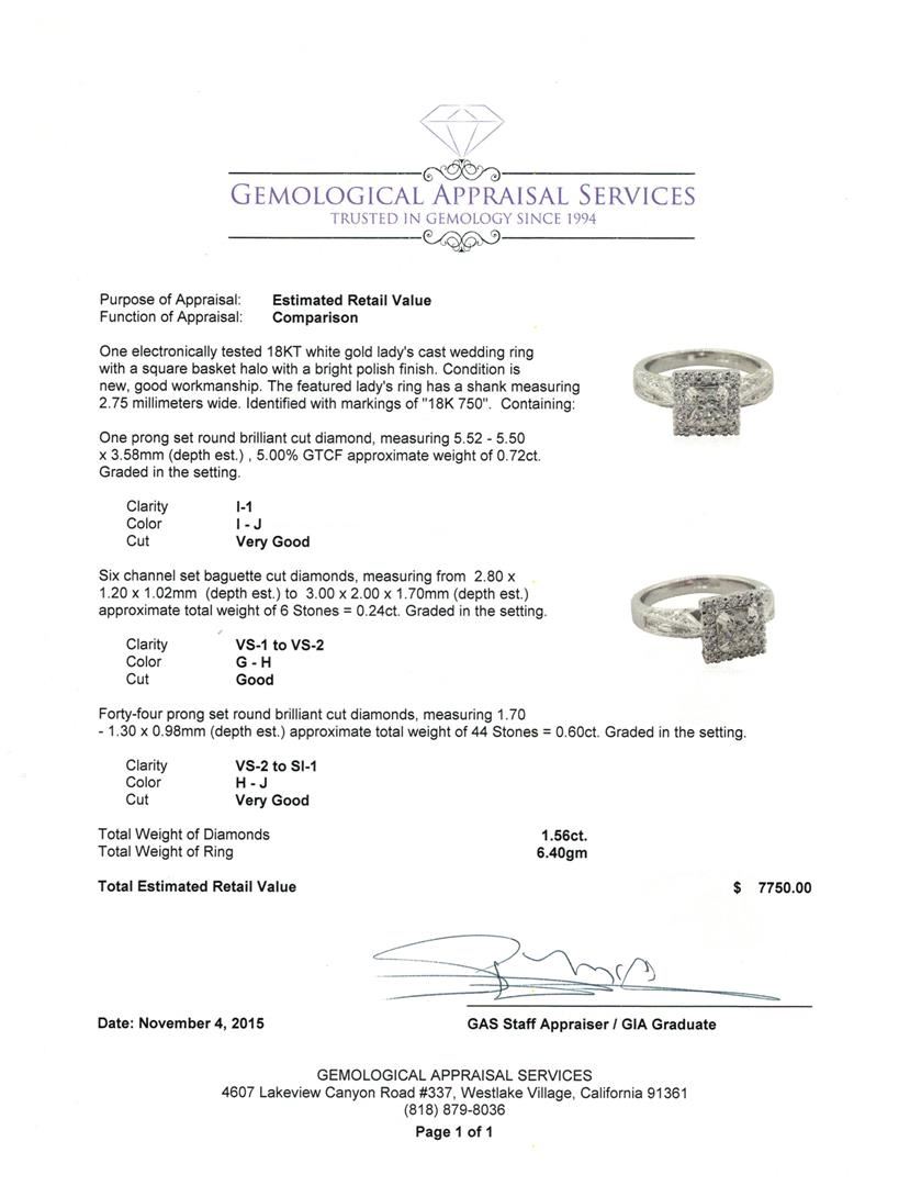 One electronically tested 18KT white gold lady's cast wedding ring with a square basket halo with a bright polish finish. The featured lady's ring has a shank measuring 2.75 millimeters wide. Identified with markings of "18K 750". Condition is new, good workmanship. Containing: One prong set round brilliant cut diamond, measuring 5.52 - 5.50 x 3.58mm (depth est.) , 5.00% GTCF approximate weight of 0.72ct. Graded in the setting. Clarity: I-1. Color: I - Very Good Six channel set baguette cut diamonds, measuring from 2.80 x 1.20 x 1.02mm (depth est.) to 3.00 x 2.00 x 1.70mm (depth est.) approximate total weight of 6 Stones = 0.24ct. Graded in the setting. Clarity: VS-1 to VS-2. Color: G - Good Forty-Four prong set round brilliant cut diamonds, measuring 1.70 - 1.30 x 0.98mm (depth est.) approximate total weight of 44 Stones = 0.60ct. Graded in the setting. Clarity: VS-2 to SI-1. Color: H - Very Good. Total Weight of Diamonds 1.56ct. Total Weight of Ring 6.40gm GAS Appraised at $7,750.00.