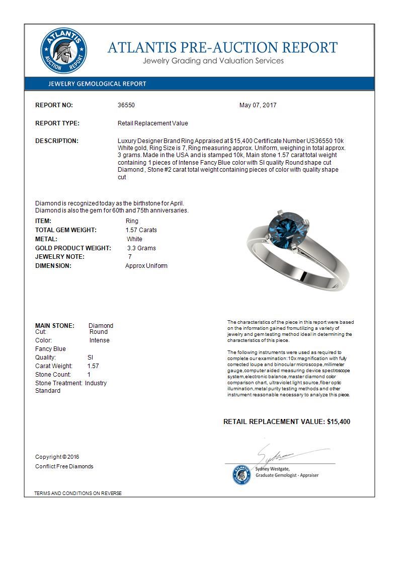 1.57 CTW Certified Intense Blue SI Diamond Solitaire Engagement Ring 10K White Gold ---- Luxury Designer Brand Ring Appraised Retail Price at $15,400 ---- SKU Number US36550 10k White gold Ring Size is 7, Ring measuring approx. Uniform, weighing in total approx. 3 grams. Made in the USA and is stamped 10k, Main stone 1.57 carat total weight containing 1 pieces of Intense Fancy Blue color with SI quality Round shape cut Diamond , Stone #2 carat total weight containing pieces of color with quality shape cut