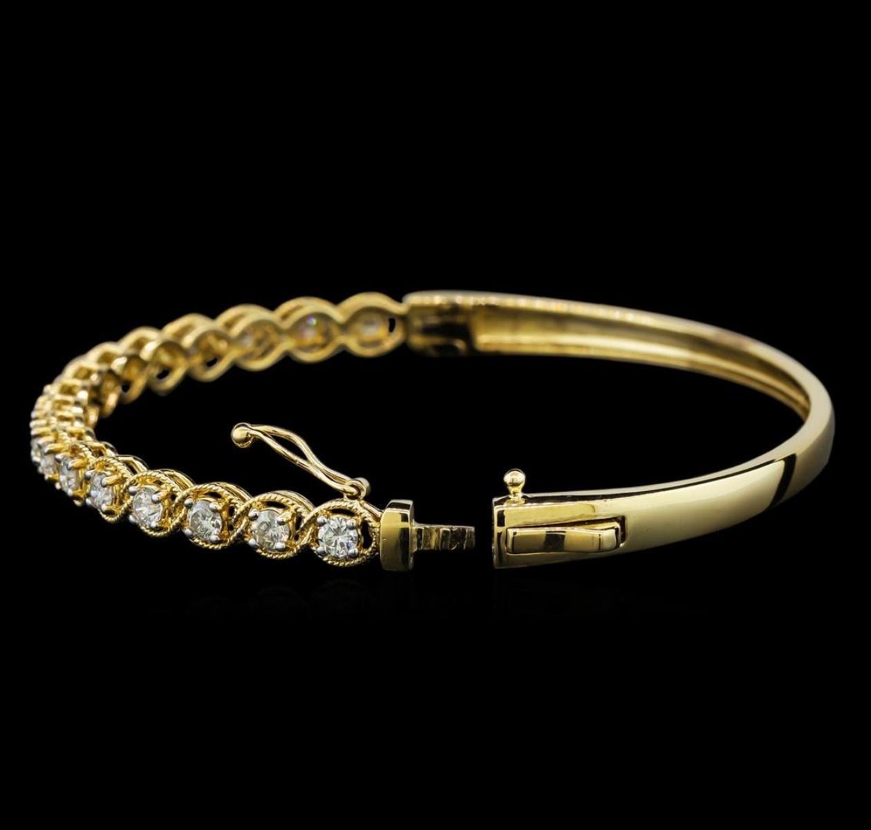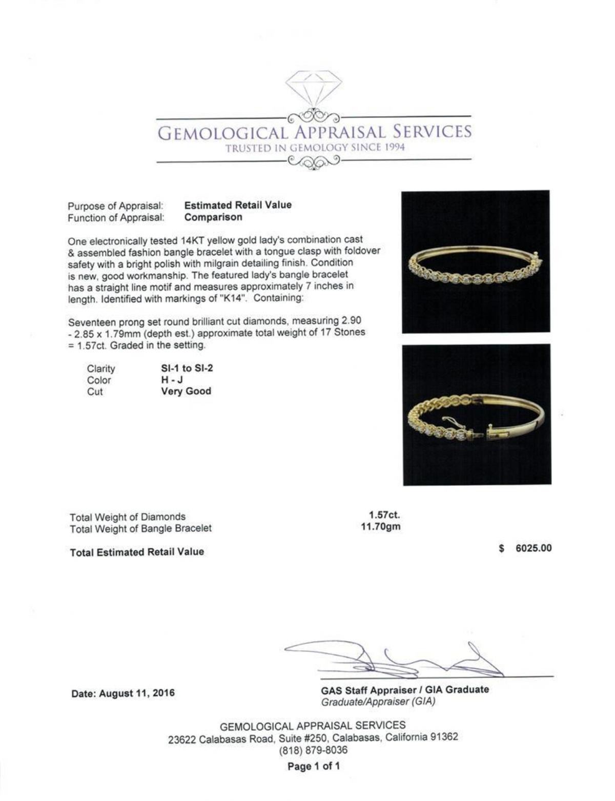 One electronically tested 14KT yellow gold lady's combination cast & assembled fashion bangle bracelet with a tongue clasp with foldover safety with a bright polish with milgrain detailing finish. The featured lady's bangle bracelet has a straight line motif and measures approximately 7 inches in length. Identified with markings of 'K14'. Condition is new, good workmanship. Containing: Seventeen prong set round brilliant cut diamonds, measuring 2.90 - 2.85 x 1.79mm (depth est.) approximate total weight of 17 Stones = 1.57ct. Graded in the setting. Clarity SI-1 to SI-2. Color: H - J Cut Very Good. Total Weight of Diamonds 1.57ct.. Total Weight of Bangle Bracelet 11.70gm. GAS Appraised.