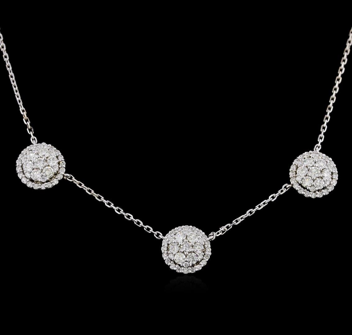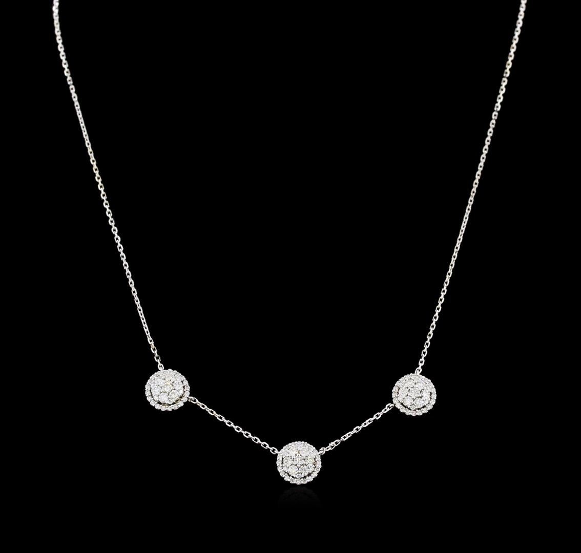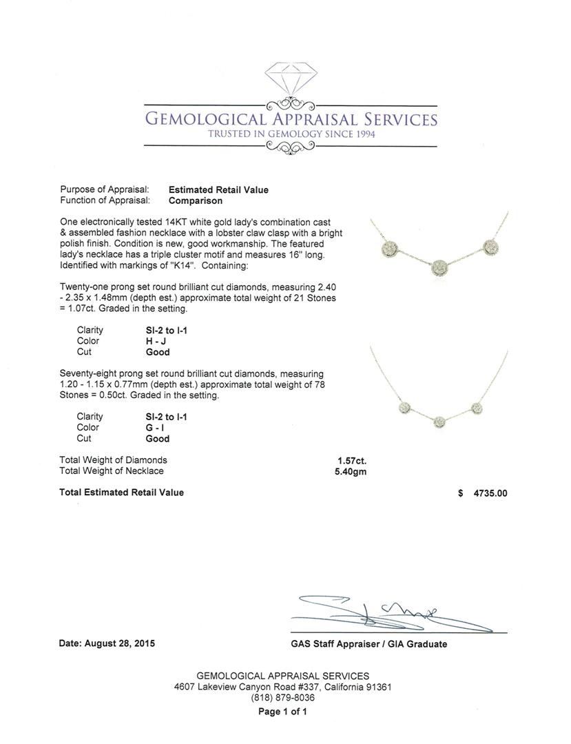 One electronically tested 14KT white gold lady's combination cast & assembled fashion necklace with a lobster claw clasp with a bright polish finish. The featured lady's necklace has a triple cluster motif and measures 16" long. Identified with markings of "K14". Condition is new, good workmanship. Containing: Twenty-One prong set round brilliant cut diamonds, measuring 2.40 - 2.35 x 1.48mm (depth est.) approximate total weight of 21 Stones = 1.07ct. Graded in the setting. Clarity: SI-2 to I-1. Color: H - Good Seventy-Eight prong set round brilliant cut diamonds, measuring 1.20 - 1.15 x 0.77mm (depth est.) approximate total weight of 78 Stones = 0.50 ct. Graded in the setting. Clarity: SI-2 to I-1. Color: G - I. Cut Good. Total Weight of Diamonds 1.57ct. Total Weight of Necklace 5.40gm.