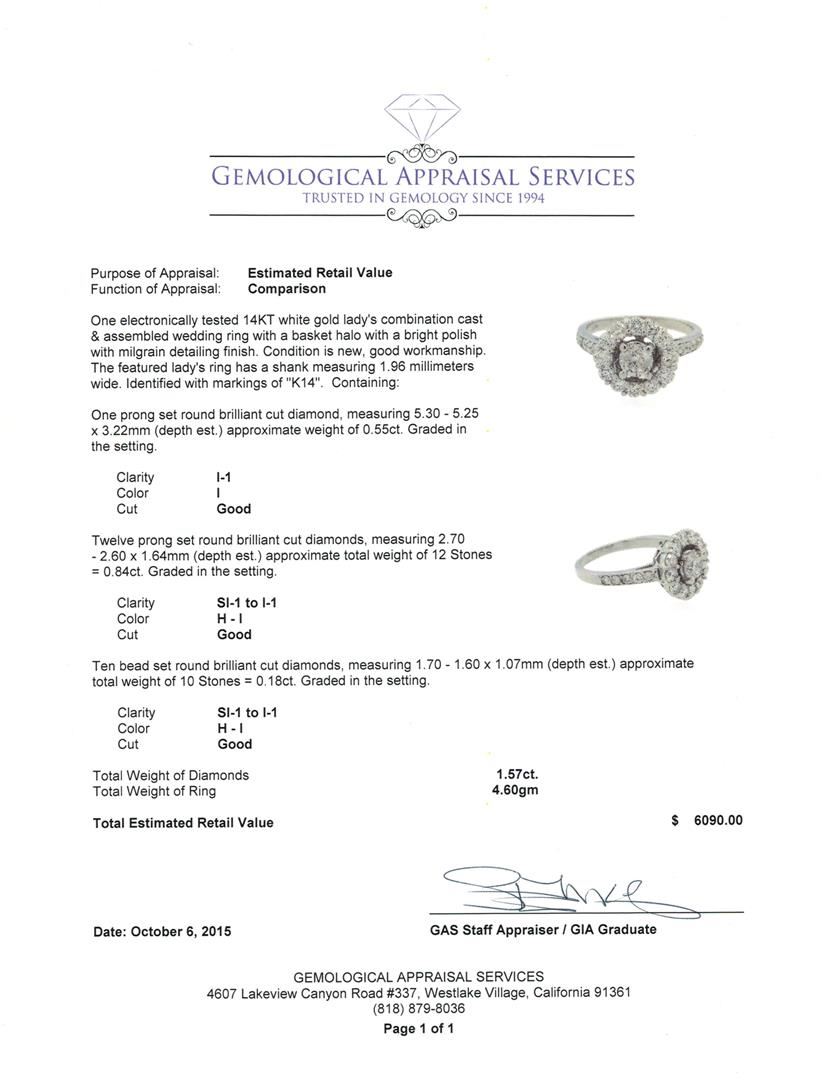 One electronically tested 14KT white gold lady's combination cast & assembled wedding ring with a basket halo with a bright polish with milgrain detailing finish. The featured lady's ring has a shank measuring 1.96 millimeters wide. Identified with markings of "K14". Condition is new, good workmanship. Containing: One prong set round brilliant cut diamond, measuring 5.30 - 5.25 x 3.22mm (depth est.) approximate weight of 0.55ct. Graded in the setting. Clarity: I-1. Color: I. Cut Good Twelve prong set round brilliant cut diamonds, measuring 2.70 - 2.60 x 1.64mm (depth est.) approximate total weight of 12 Stones = 0.84ct. Graded in the setting. Clarity: SI-1 to I-1. Color: H - I. Cut Good Ten bead set round brilliant cut diamonds, measuring 1.70 - 1.60 x 1.07mm (depth est.) approximate total weight of 10 Stones = 0.18ct. Graded in the setting. Clarity: SI-1 to I-1. Color: H - I. Cut Good. Total Weight of Diamonds 1.57ct. Total Weight of Ring 4.60gm. GAS Appraised at $6,090.00.