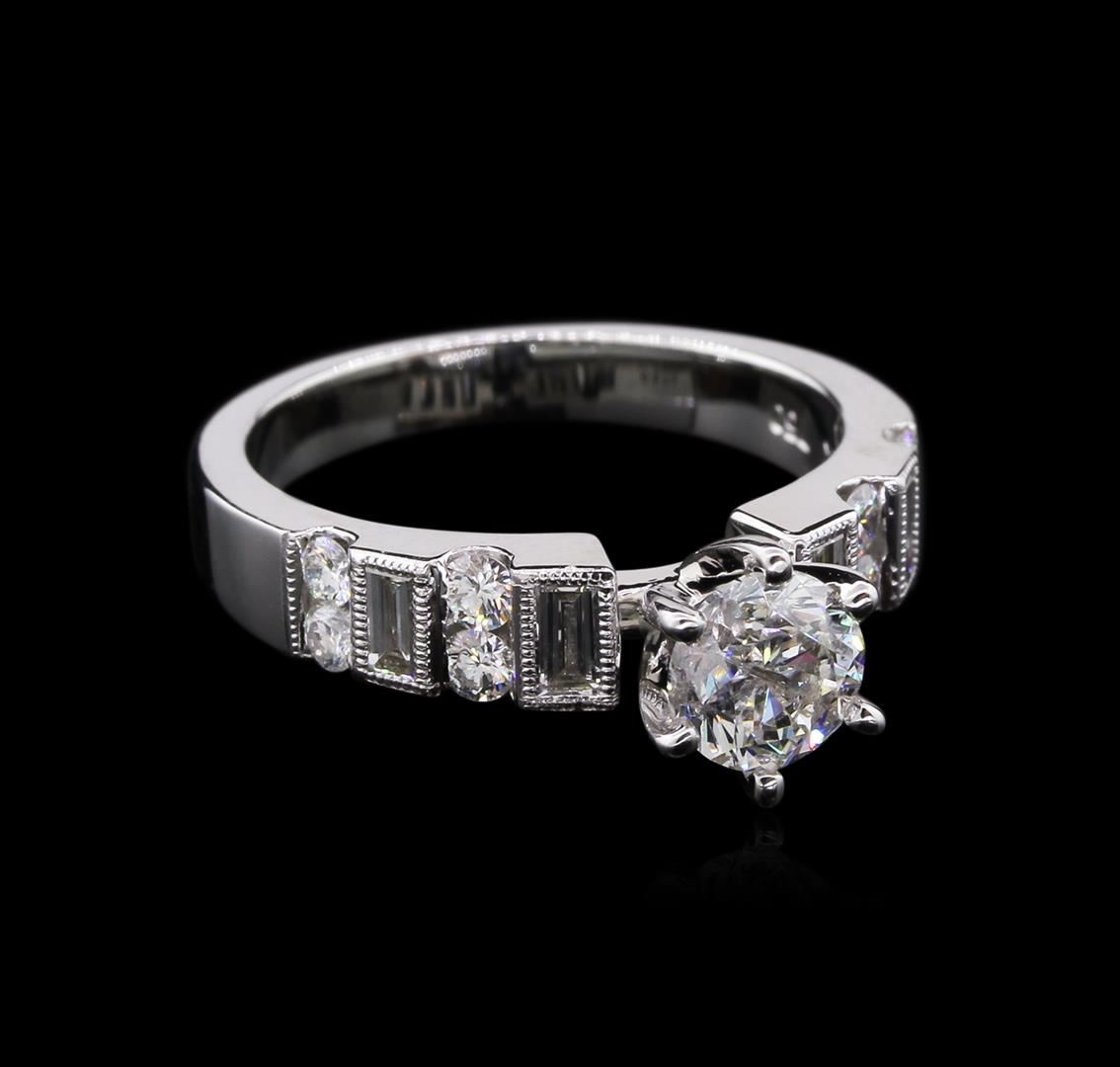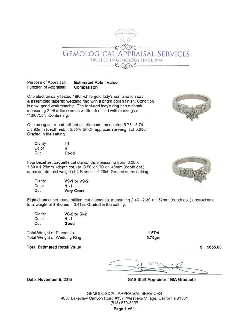 One electronically tested 18KT white gold lady's combination cast & assembled tapered wedding ring with a bright polish finish. The featured lady's ring has a shank measuring 2.99 millimeters in width. Identified with markings of "18K 750". Condition is new, good workmanship. Containing: One prong set round brilliant cut diamond, measuring 5.78 - 5.74 x 3.90mm (depth est.) , 5.00% GTCF approximate weight of 0.88ct. Graded in the setting. Clarity: I-1. Color: Good Four bezel set baguette cut diamonds, measuring from 3.30 x 1.50 x 1.28mm (depth est.) to 3.50 x 1.70 x 1.45mm (depth est.) approximate total weight of 4 Stones = 0.28ct. Graded in the setting. Clarity: VS-1 to VS-2. Color: H - I. Cut Very Good Eight channel set round brilliant cut diamonds, measuring 2.40 - 2.30 x 1.52mm (depth est.) approximate total weight of 8 Stones = 0.41ct. Graded in the setting. Clarity: VS-2 to SI-2. Color: H - I. Cut Good. Total Weight of Diamonds 1.57ct. Total Weight of Wedding Ring 5.70gm GAS Appraised at $9,655.00.