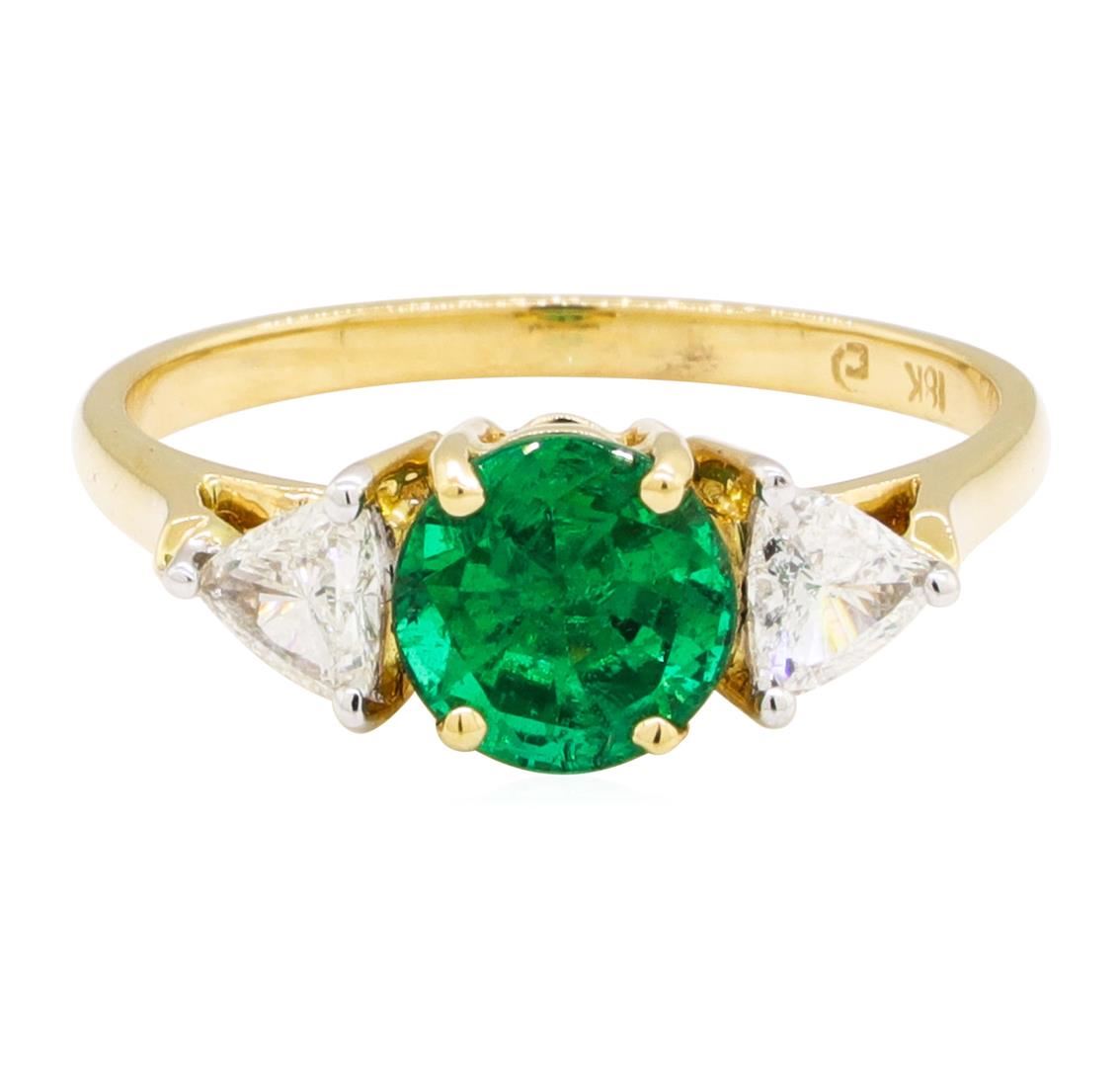 One electronically tested 18KT yellow gold lady's cast fashion ring with a 3-stone straight line with a bright polish finish. The featured lady's ring has a shank measuring 1.68 millimeters wide. Identified with markings of '18K'. Condition is new, good workmanship. Containing: One prong set round modified mixed cut natural emerald, measuring 6.71 - 6.67 x 4.80 mm, (depth est.) approximate weight of 1.20ct., clarity is moderately included, medium, strong, very slightly bluish green color, (GIA vslbG 5/5), cut is good. Transmitting light somewhat diffusely, transparent to translucent. Naturally occurring internal & external characteristics are present. Indications of oil residue. Colored gemstones are presumed to have been subjected to commonly used enhancement processes. Graded in the setting. Two prong set triangle brilliant cut diamonds, measuring 4.00 x 3.80 x 2.36mm (depth est.) approximate total weight of 2 Stones = 0.37ct. Graded in the setting. Color H - I Clarity VS-2 Cut Very Good. Total Weight of Colored Stones 1.20ct.. Total Weight of Diamonds 0.37ct.. Total Weight of Ring 3.10gm GAS Appraised at $13385.00. GAS Appraised at $13,385.00.