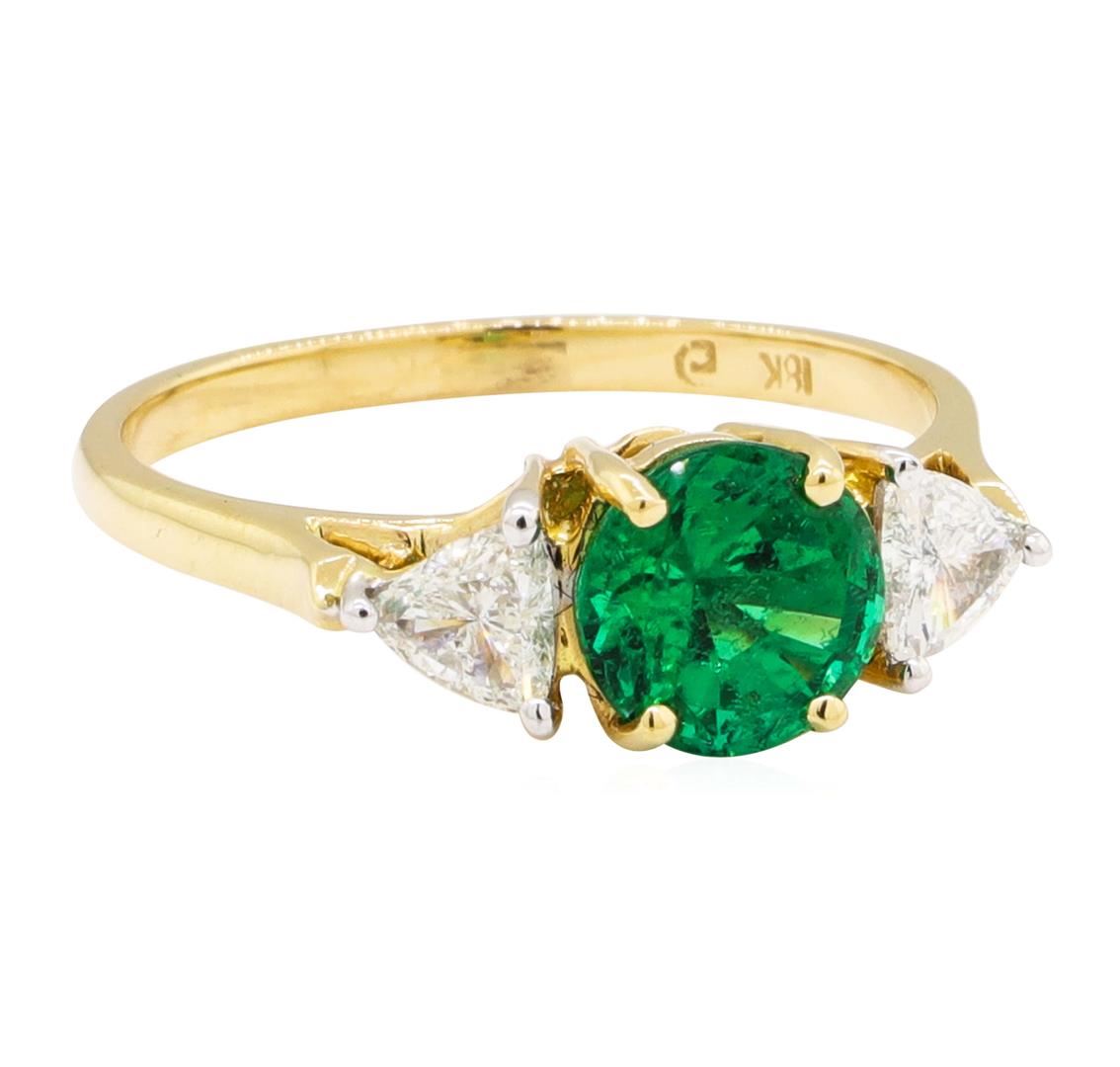 One electronically tested 18KT yellow gold lady's cast fashion ring with a 3-stone straight line with a bright polish finish. The featured lady's ring has a shank measuring 1.68 millimeters wide. Identified with markings of '18K'. Condition is new, good workmanship. Containing: One prong set round modified mixed cut natural emerald, measuring 6.71 - 6.67 x 4.80 mm, (depth est.) approximate weight of 1.20ct., clarity is moderately included, medium, strong, very slightly bluish green color, (GIA vslbG 5/5), cut is good. Transmitting light somewhat diffusely, transparent to translucent. Naturally occurring internal & external characteristics are present. Indications of oil residue. Colored gemstones are presumed to have been subjected to commonly used enhancement processes. Graded in the setting. Two prong set triangle brilliant cut diamonds, measuring 4.00 x 3.80 x 2.36mm (depth est.) approximate total weight of 2 Stones = 0.37ct. Graded in the setting. Color H - I Clarity VS-2 Cut Very Good. Total Weight of Colored Stones 1.20ct.. Total Weight of Diamonds 0.37ct.. Total Weight of Ring 3.10gm GAS Appraised at $13385.00. GAS Appraised at $13,385.00.