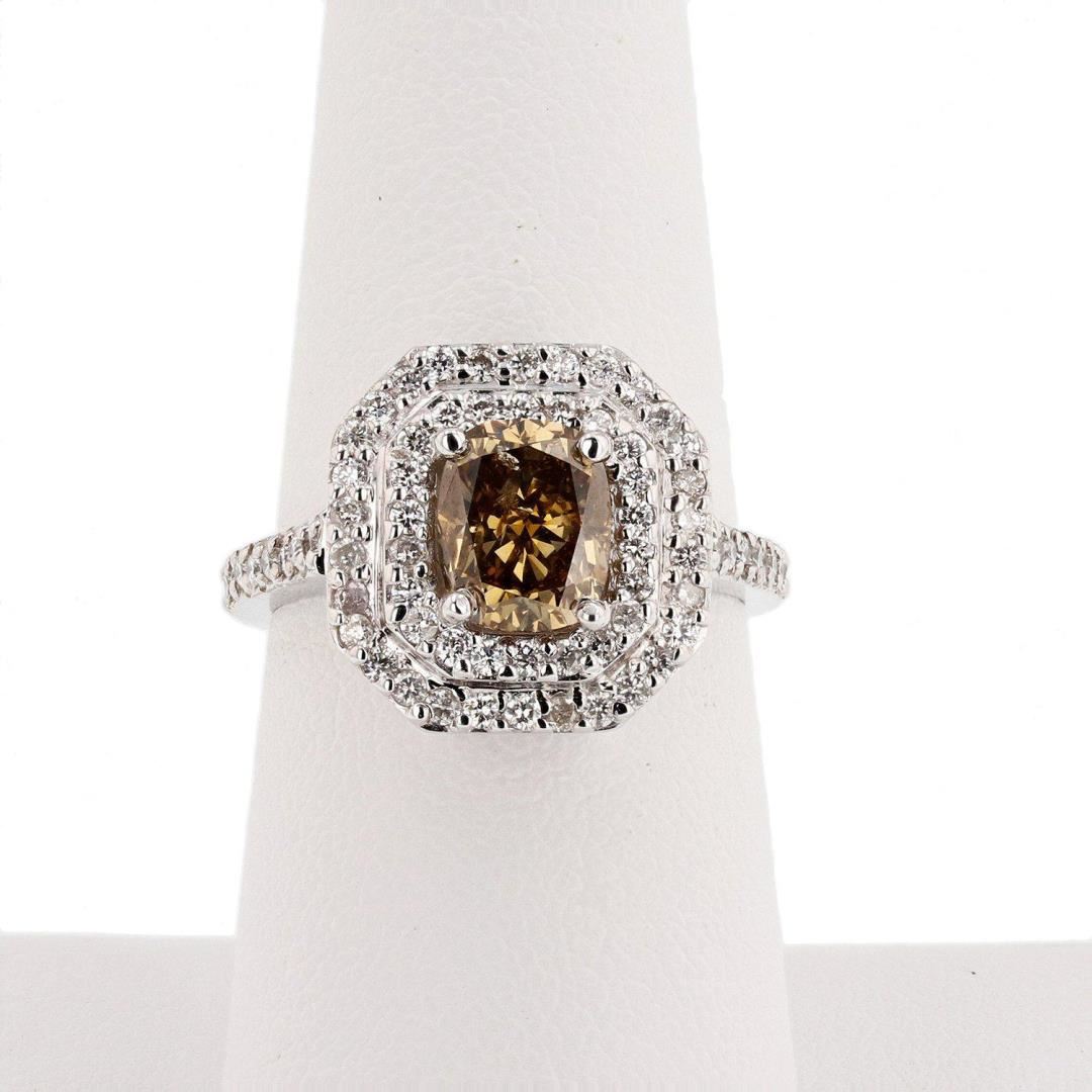 One electronically tested 14KT white gold ladies cast diamond ring with a bright polish finish. Condition is new, good workmanship. The featured diamond is set within tiered diamond bezels supported by diamond set shoulders, completed by a two millimeter wide band. Identified with markings of "K14". Containing: One prong set cushion cut diamond, measuring 7.53mm x 6.13mm x 4.35mm exact weight 1.57ct. GIA Colored Diamond Report attached. Graded loose prior to setting in the GIA Laboratory, Report #5171196947. Clarity I2 Color Fancy Dark Yellowish Brown Depth 71.0% Table 66.0% Polish Very Good Symmetry Good. Eighty-two prong set round brilliant cut diamonds approximate total weight of 82 Stones = 0.74ct. Graded in the setting. Clarity I1 to I2 Color G - I Total Weight of Diamonds 2.31ct. Total Weight of Ring 5.16 gm #Size: 6 1/2