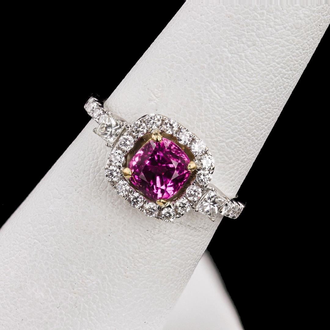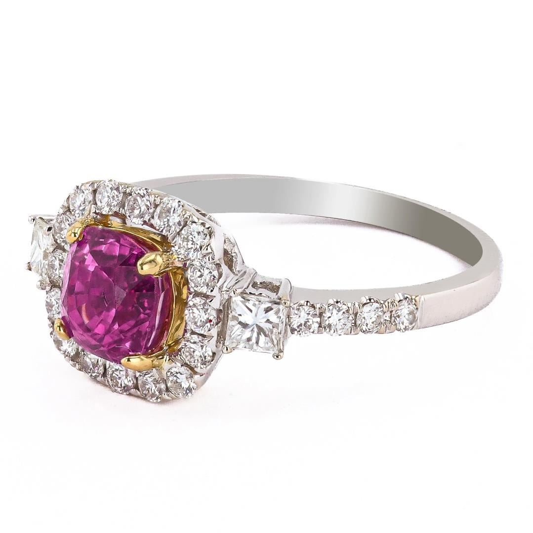 Eighteen karat (18K) two tone gold natural fancy sapphire corundum and diamond ring. A cushion brilliant cut natural pink sapphire corundum gemstone is mounted in the center of the ring. Princess and round brilliant cut diamonds accent the ring around and on both sides of the center gemstone. The ring has a gross weight of 9.6 Grams. #NATURAL GEMSTONE# GEMSTONE: Sapphire Corundum NATURE: Natural SHAPE: Cushion Brilliant, Faceted Cut WEIGHT: 1.57 carat total DIMENSIONS: 5.86 x 5.62mm CLARITY: Type 2 COLOR: Pink (5/5) SYMMETRY: Excellent COLOR INTENSITY: Intense TRANSPARENCY: Transparent TONE: Dark #NATURAL DIAMOND# SHAPE: Princess and Round Brilliant Cut WEIGHT: 0.37 carat total (26pcs.) DIMENSIONS: 2.5 x 1.4mm AVERAGE CLARITY: VS1-SI1 AVERAGE COLOR: G-H SYMMETRY: Excellent POLISH: Excellent #METAL# METAL: Gold PURITY: 18K (750) COLOR: Two Tone (White and Yellow) CONDITION: Excellent FINISH: High Polish