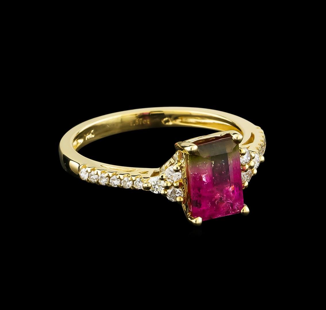 One prong set rectangular step cut natural bi-color tourmaline, measuring 8.10 x 5.15 x 3.60mm, 6%. bulge factor, approximate weight of 1.57ct., clarity is moderately included, type II, medium dark, very slightly grayish, slightly yellowish green color, (GIA slyG 6/3) to medium, moderately strong, slightly purplish red, (GIA slpR 5/4), cut is good. Transmitting light somewhat diffusely, transparent to translucent. Naturally occurring internal & external characteristics are present. Graded in the setting. Eighteen prong set round brilliant cut diamonds, measuring 1.80 - 1.20 x 0.90mm (depth est.) approximate total weight of 18 Stones = 0.30ct. Graded in the setting. Clarity: SI-2 to I-1. Color: F - H. Total Weight of Colored Stones 1.57ct. Total Weight of Diamonds 0.30ct. Total Weight of Ring 2.77gm. AIG Appraised at $1,775.00.