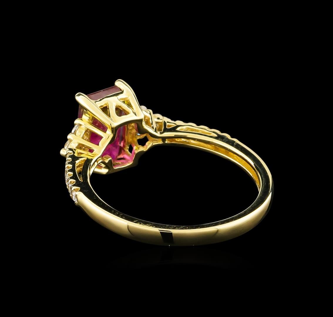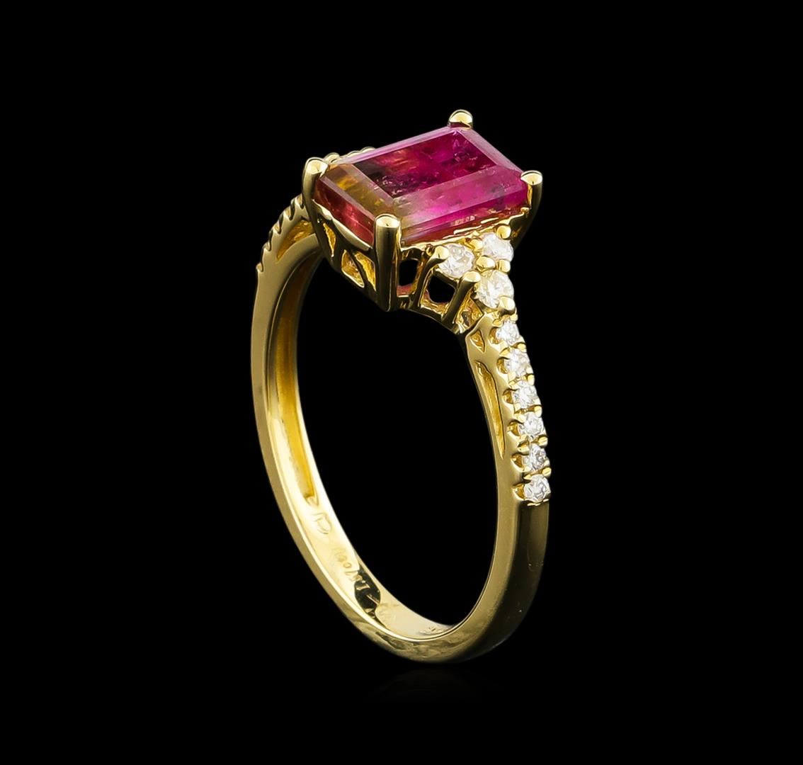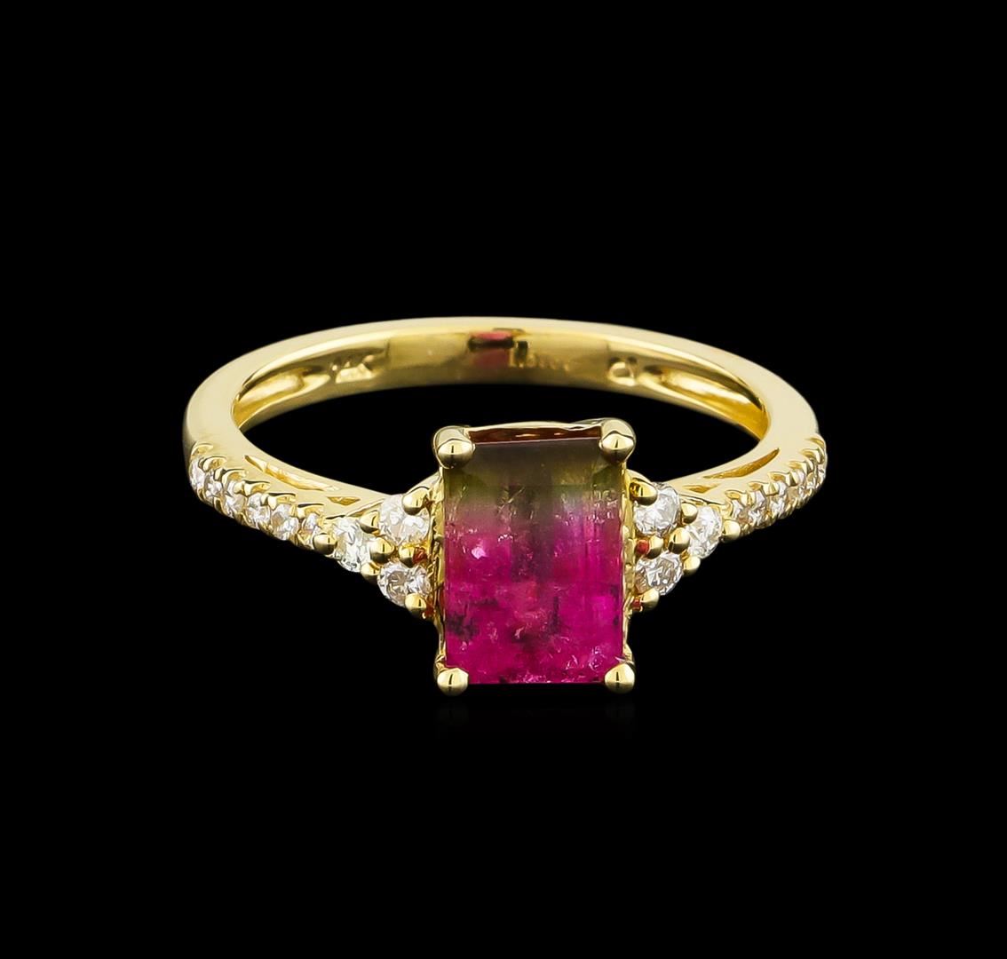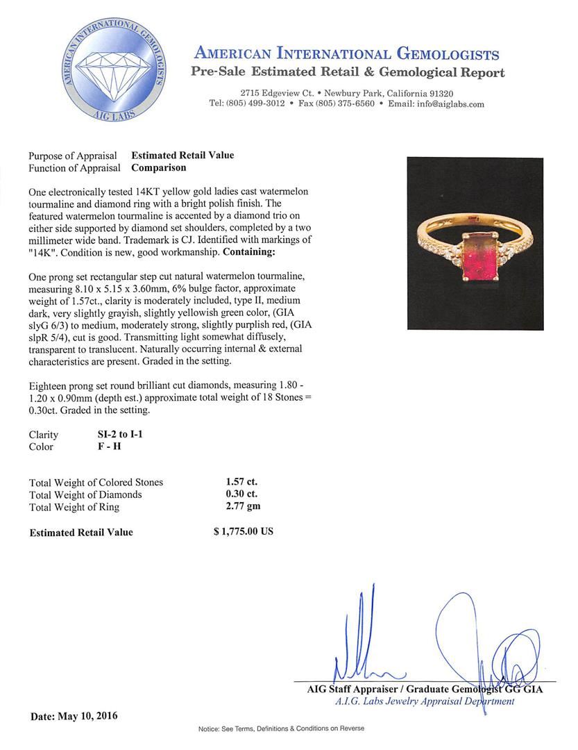 One prong set rectangular step cut natural bi-color tourmaline, measuring 8.10 x 5.15 x 3.60mm, 6%. bulge factor, approximate weight of 1.57ct., clarity is moderately included, type II, medium dark, very slightly grayish, slightly yellowish green color, (GIA slyG 6/3) to medium, moderately strong, slightly purplish red, (GIA slpR 5/4), cut is good. Transmitting light somewhat diffusely, transparent to translucent. Naturally occurring internal & external characteristics are present. Graded in the setting. Eighteen prong set round brilliant cut diamonds, measuring 1.80 - 1.20 x 0.90mm (depth est.) approximate total weight of 18 Stones = 0.30ct. Graded in the setting. Clarity: SI-2 to I-1. Color: F - H. Total Weight of Colored Stones 1.57ct. Total Weight of Diamonds 0.30ct. Total Weight of Ring 2.77gm. AIG Appraised at $1,775.00.