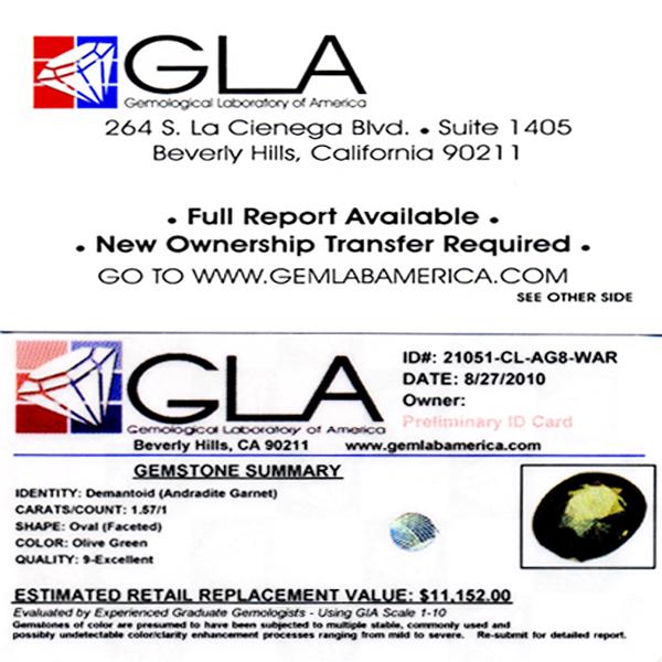 Excellent olive green colored specimen oval cut; lab quality evaluation 9; treatment as noted; Gem Guide wholesale $1963-$2748; full retail appraisal $11152; full lab evaluation available