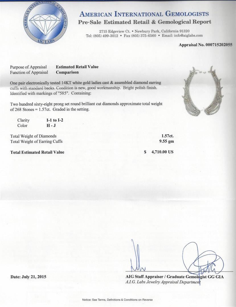 One pair electronically tested 14KT white gold ladies cast & assembled diamond earring cuffs with standard backs. Bright polish finish. Identified with markings of "585". Condition is new, good workmanship. Containing: Two Hundred Sixty-Eight prong set round brilliant cut diamonds approximate total weight of 268 Stones = 1.57ct. Graded in the setting. Clarity I-1 to I-2 Color H - J. Total Weight of Diamonds 1.57ct. Total Weight of Earring Cuffs 9.55 grams. AIG Appraised at $4,710.00.