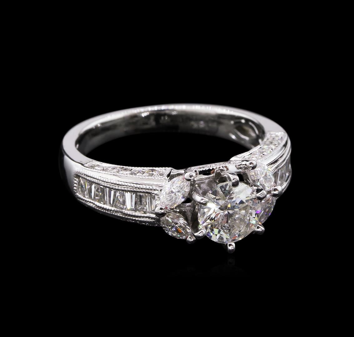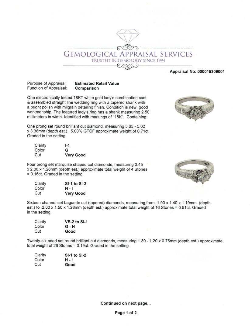 One electronically tested 18KT white gold lady's combination cast & assembled straight line wedding ring with a tapered shank with a bright polish with milgrain detailing finish. The featured lady's ring has a shank measuring 2.50 millimeters in width. Identified with markings of "18K". Condition is new, good workmanship. Containing: One prong set round brilliant cut diamond, measuring 5.65 - 5.62 x 3.38mm (depth est.) , 5.00% GTCF approximate weight of 0.71ct. Graded in the setting. Clarity: I-1. Color: Very Good Four prong set marquise shaped cut diamonds, measuring 3.45 x 2.00 x 1.26mm (depth est.) approximate total weight of 4 Stones = 0.16ct. Graded in the setting. Clarity: SI-1 to SI-2. Color: H - I. Cut Very Good Sixteen channel set baguette cut (tapered) diamonds, measuring from 1.90 x 1.40 x 1.19mm (depth est.) to 2.00 x 1.50 x 1.28mm (depth est.) approximate total weight of 16 Stones = 0.51ct. Graded in the setting. Clarity: VS-2 to SI-1. Color: G - Good Twenty-Six bead set round brilliant cut diamonds, measuring 1.30 - 1.20 x 0.75mm (depth est.) approximate total weight of 26 Stones = 0.19ct. Graded in the setting. Clarity: SI-1 to SI-2. Color: H - I. Cut Good. Total Weight of Diamonds 1.57ct. Total Weight of Wedding Ring 4.90gm GAS Appraised at $9,790.00.