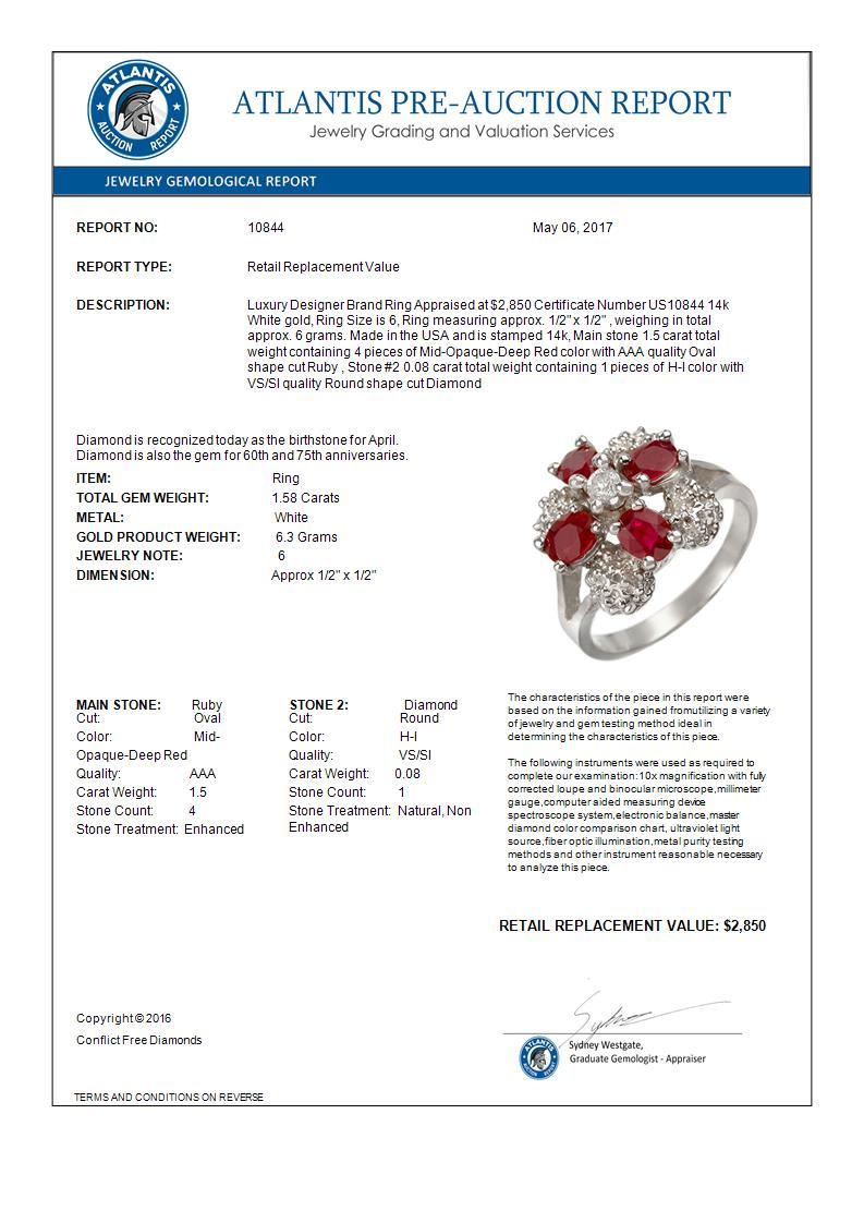 1.58 CTW Ruby & Diamond Ring 14K White Gold ---- Luxury Designer Brand Ring Appraised Retail Price at $2,850 ---- SKU Number US10844 14k White gold Ring Size is 6, Ring measuring approx. 1/2" x 1/2" , weighing in total approx. 6 grams. Made in the USA and is stamped 14k, Main stone 1.5 carat total weight containing 4 pieces of Mid-Opaque-Deep Red color with AAA quality Oval shape cut Ruby , Stone #2 0.08 carat total weight containing 1 pieces of H-I color with VS/SI quality Round shape cut