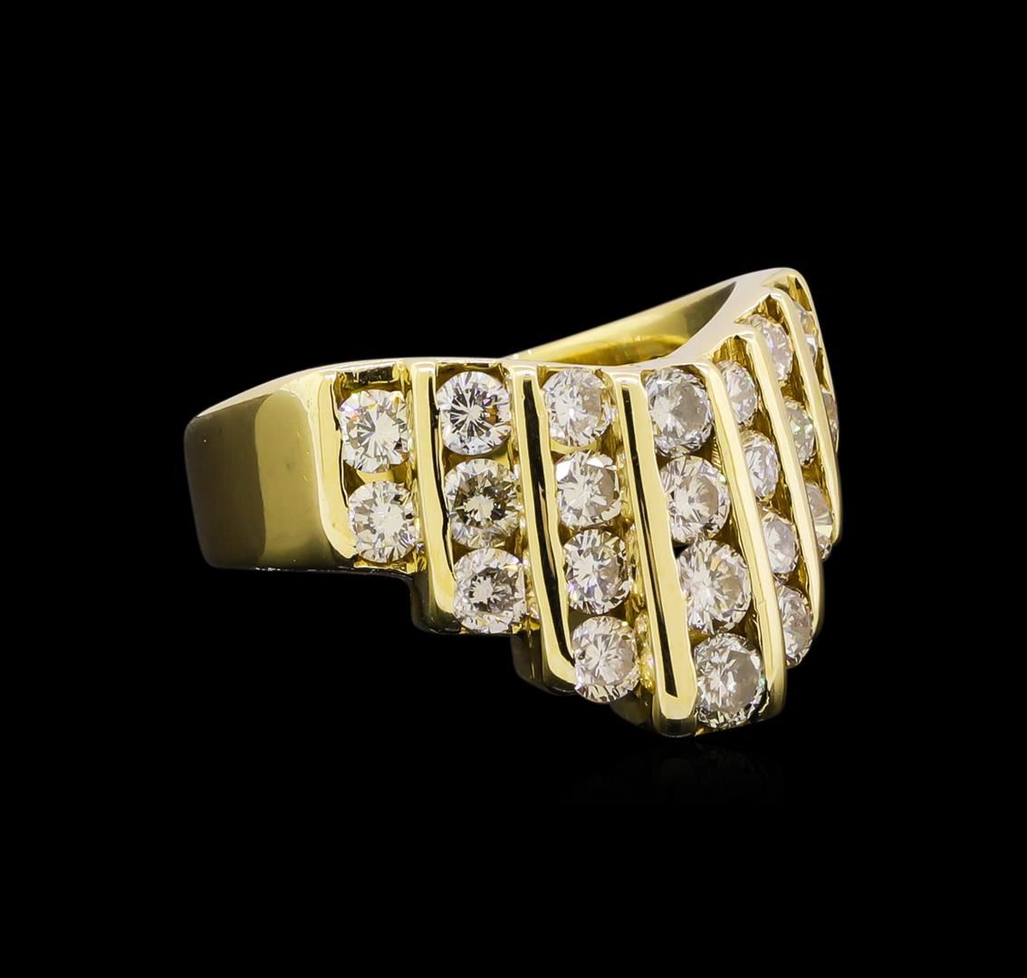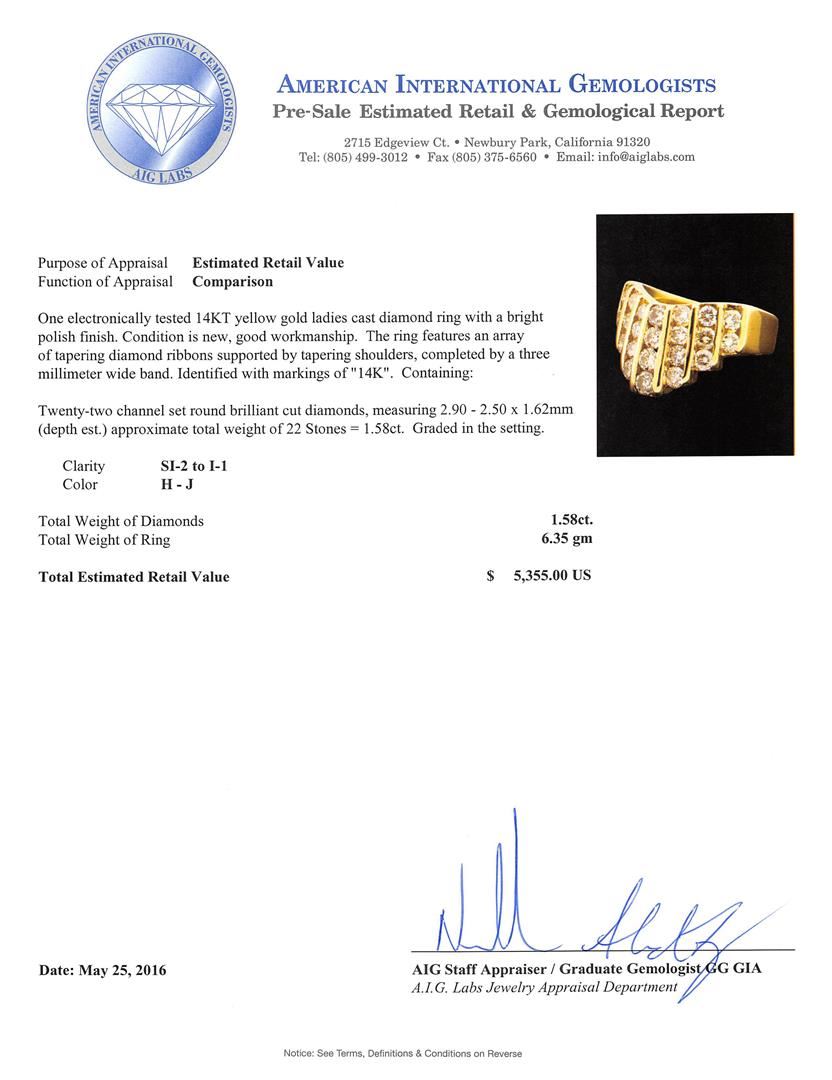 One electronically tested 14KT yellow gold ladies cast diamond ring with a bright polish finish. The ring features an array of tapering diamond ribbons supported by tapering shoulders, completed by a three millimeter wide band. Identified with markings of "14K". Condition is new, good workmanship. Containing: Twenty-Two channel set round brilliant cut diamonds, measuring 2.90 - 2.50 x 1.62mm (depth est.) approximate total weight of 22 Stones = 1.58ct. Graded in the setting. Clarity: SI-2 to I-1. Color: H - J. Total Weight of Diamonds 1.58ct. Total Weight of Ring 6.35gm. AIG Appraised at $5,355.00.