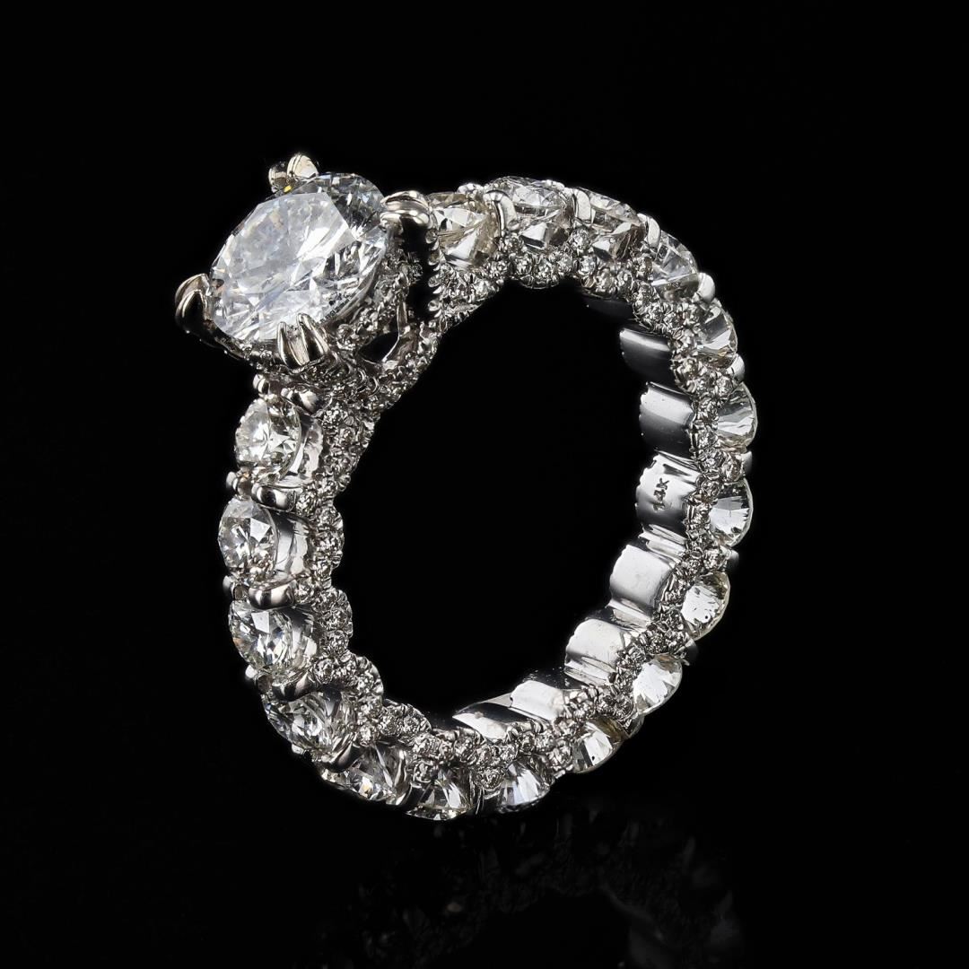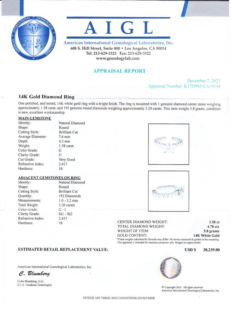 One polished. and tested. 14K white gold ring with a bright finish. The ring is mounted with 1 genuine diamond center stone weighing approximately 1.58 carat, and 193 genuine round diamonds weighing approximately 3.20 carats. This item weighs 5.8 grams, c