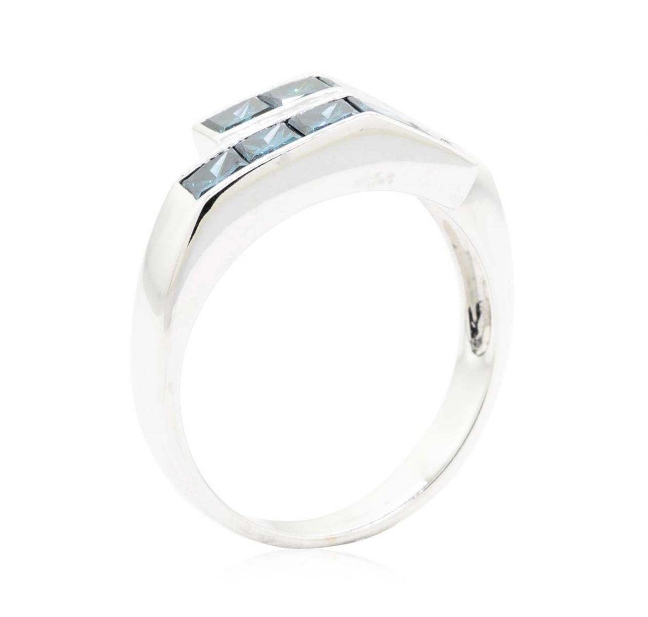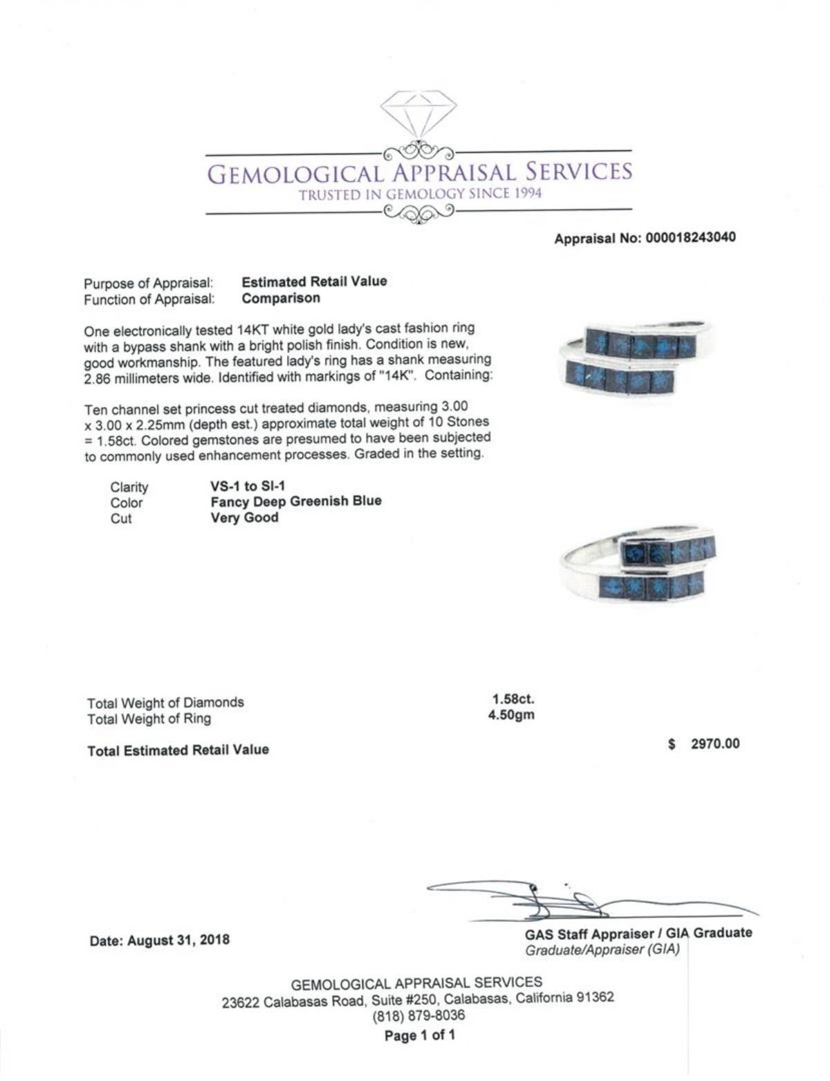 One electronically tested 14KT white gold lady's cast fashion ring with a bypass shank with a bright polish finish. The featured lady's ring has a shank measuring 2.86 millimeters wide. Identified with markings of '14K'. Condition is new, good workmanship. Containing: Ten channel set princess cut treated diamonds, measuring 3.00 x 3.00 x 2.25mm (depth est.) approximate total weight of 10 Stones = 1.58ct. Colored gemstones are presumed to have been subjected to commonly used enhancement processes. Graded in the setting. Color Fancy Deep Greenish Blue Clarity VS-1 to SI-1 Cut Very Good. Total Weight of Diamonds 1.58ct.. Total Weight of Ring 4.50gm GAS Appraised at $2970.00. GAS Appraised.