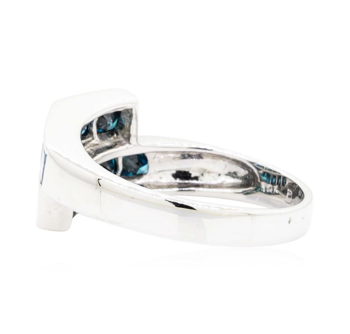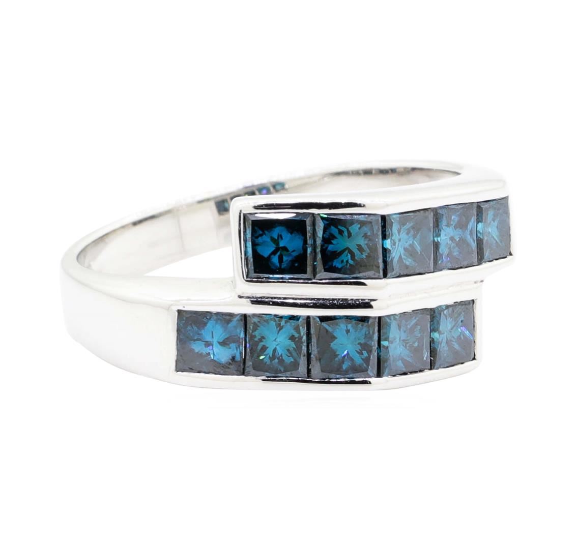One electronically tested 14KT white gold lady's cast fashion ring with a bypass shank with a bright polish finish. The featured lady's ring has a shank measuring 2.86 millimeters wide. Identified with markings of '14K'. Condition is new, good workmanship. Containing: Ten channel set princess cut treated diamonds, measuring 3.00 x 3.00 x 2.25mm (depth est.) approximate total weight of 10 Stones = 1.58ct. Colored gemstones are presumed to have been subjected to commonly used enhancement processes. Graded in the setting. Color Fancy Deep Greenish Blue Clarity VS-1 to SI-1 Cut Very Good. Total Weight of Diamonds 1.58ct.. Total Weight of Ring 4.50gm GAS Appraised at $2970.00. GAS Appraised.