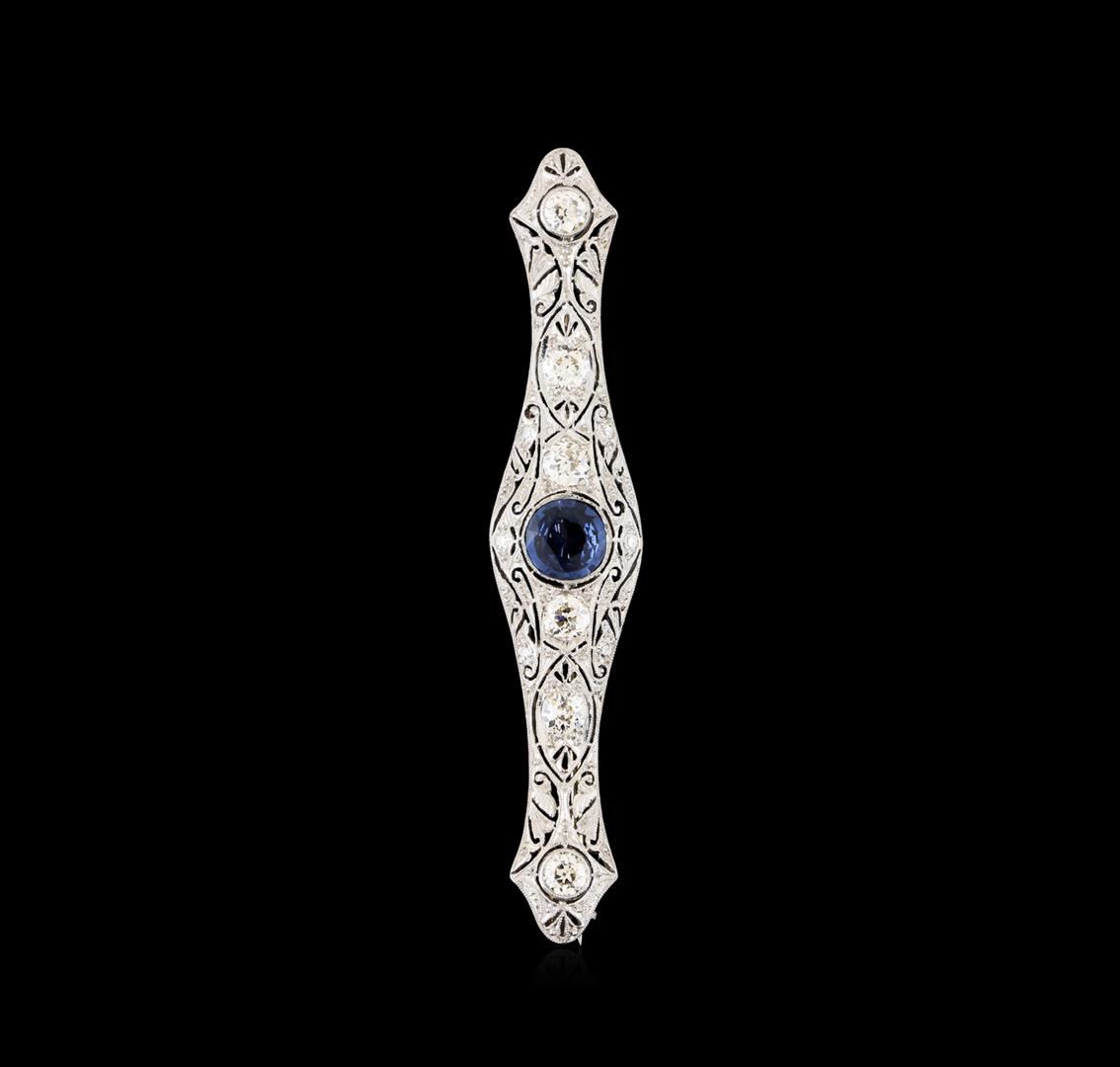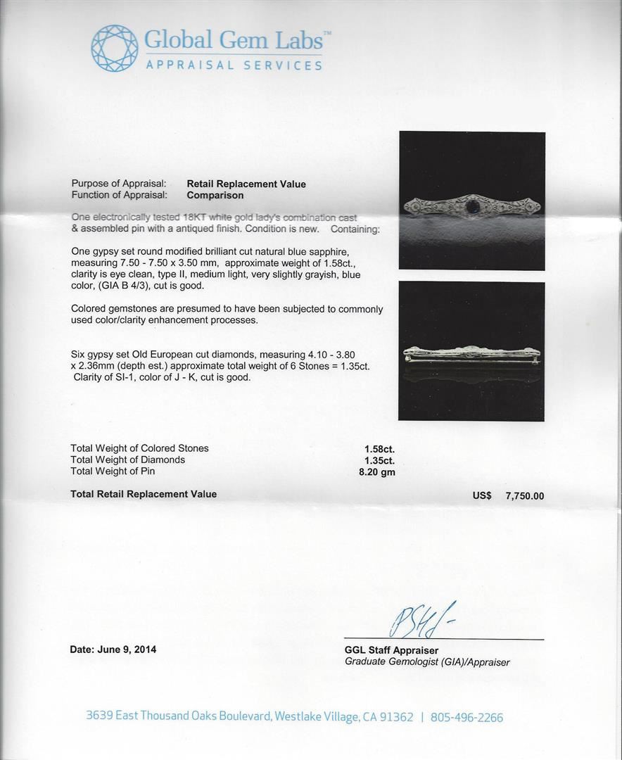 One electronically tested 18KT white gold lady's combination cast and assembled pin with an antiqued finish. Condition is new. Containing: one gypsy set round modified brilliant cut natural blue sapphire, measuring 7.50 - 7.50 x 3.50 mm, approximate weight of 1.58ct., eye clean clarity, type II, medium light, very slightly grayish, blue color, (GIA B 4/3), cut is good. Colored gemstones are presumed to have been subjected to commonly used enhancement processes. Six gypsy set old European cut diamonds, measuring 4.10 - 3.80 x 2.36mm (depth est.) approximate total weight of 6 Stones = 1.35ct. Clarity of SI-1, color of J-K, cut is good. Total Weight of Colored Stones: 1.58ct, Total Weight of Diamonds: 1.35ct., Total Weight of Pin: 8.20 grams. GGL Appraised at $7,750.00.
