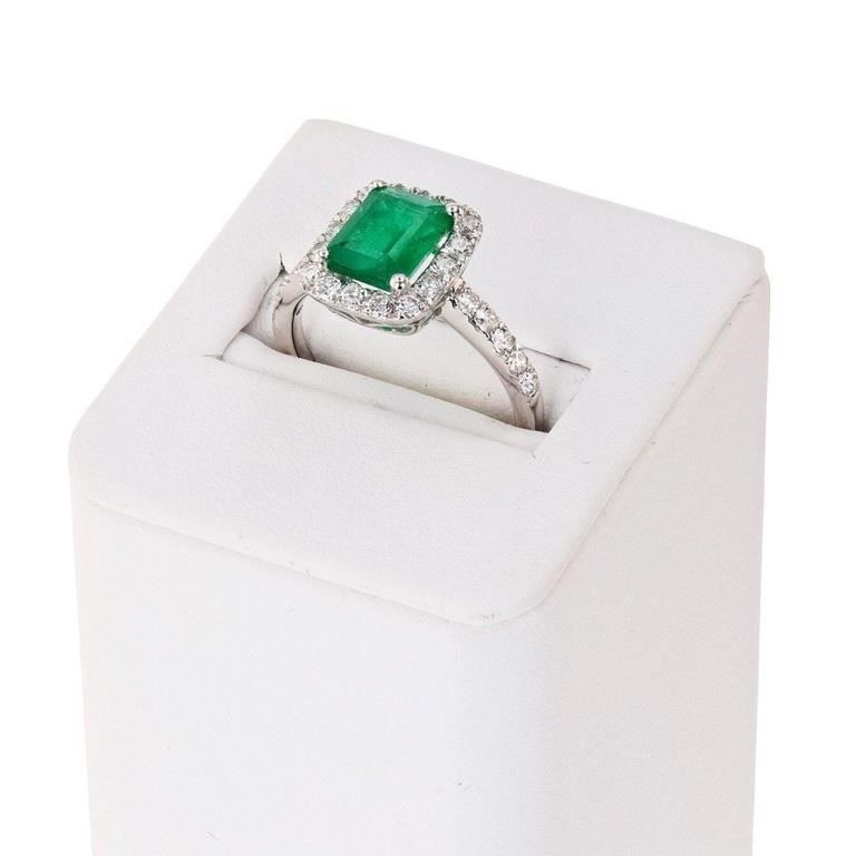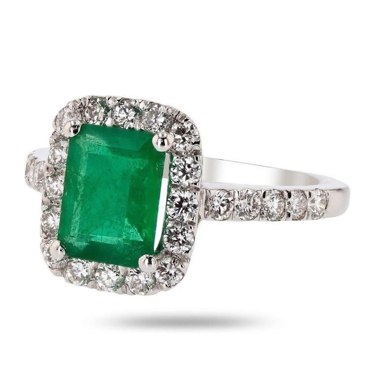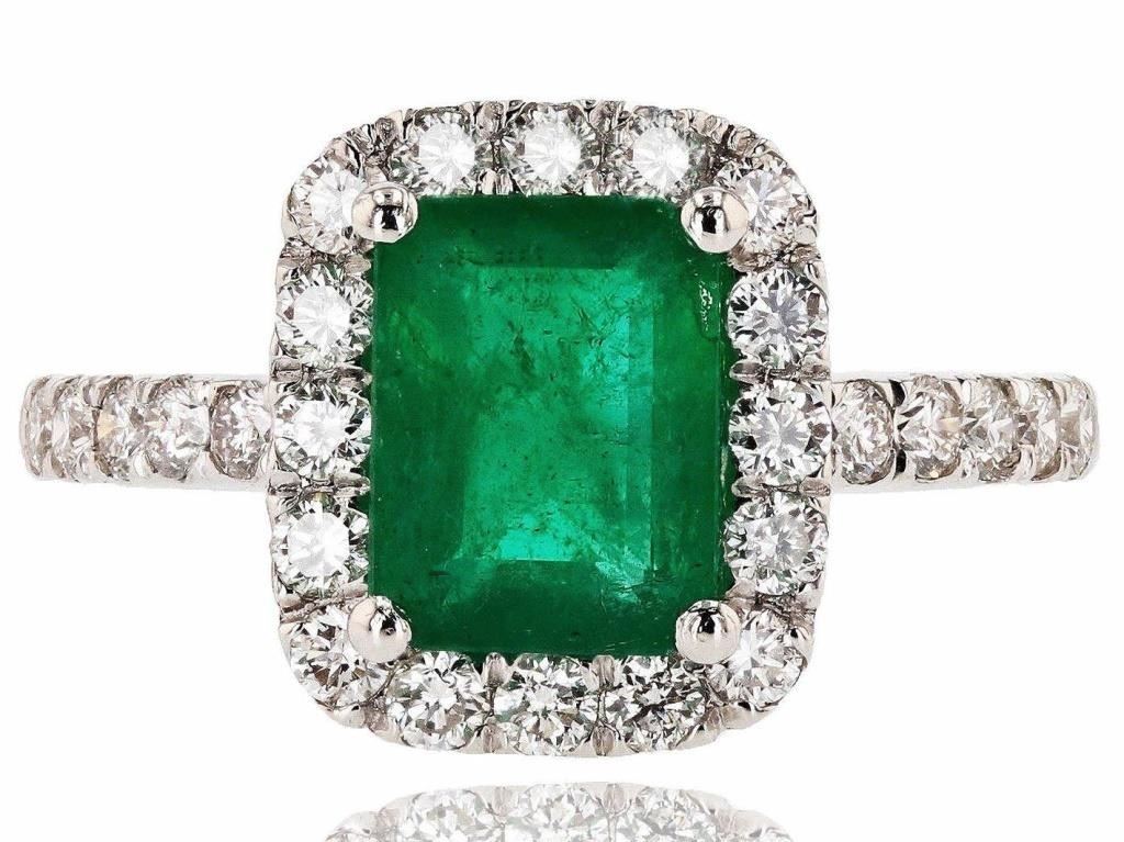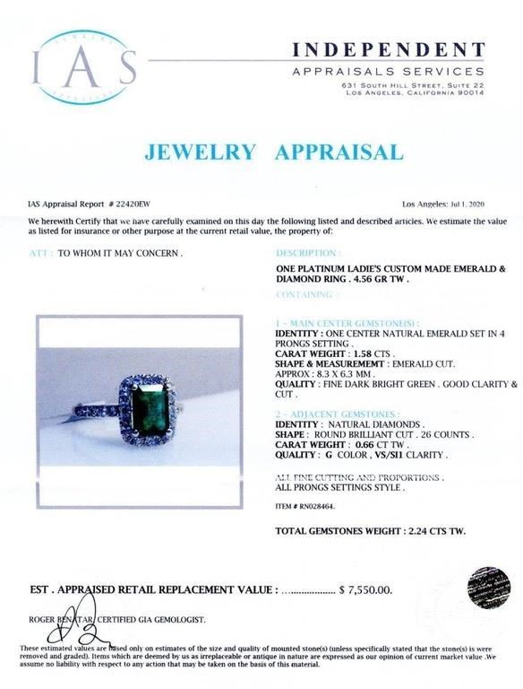 Description: one platinum ladies custom made emerald & diamond ring . 4.56 gr tw . Containing: 1 - main center gemstone(s) : identity : one center natural emerald set in 4 prongs setting. Carat weight : 1.58 cts. Shape & measurememt : emerald cut. Approx : 8.3 x 6.3 mm. Quality : fine dark bright green. Good clarity & cut. 2 - adjacent gemstones : identity : natural diamonds. Shape : round brilliant cut. 26 counts. Carat weight : 0.66 ct tw. Quality : g color , vs/si1 clarity. All fine cutting and proportions. All prongs settings style.