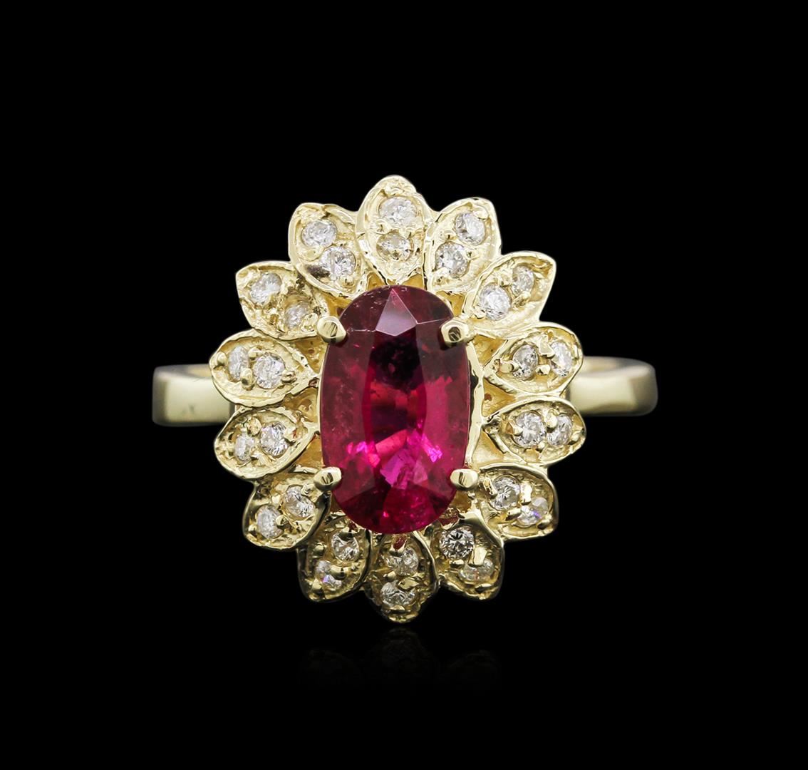 One electronically tested 14KT yellow gold lady's cast flower design ring with a basket setting with a bright polish finish. The featured lady's ring has a 2.75 millimeter wide shank. Identified with markings of "14K". Condition is new, good workmanship. Containing: One prong set oval modified brilliant cut natural pink tourmaline, measuring 9.93 x 5.96 x 3.98mm, 5% bulge factor, approximate weight of 1.58ct., clarity is slightly included, type II, medium, moderately strong, slightly purplish red color, (GIA slpR 5/4), cut is good. Transmitting light with a minimum of distortion, transparent. Naturally occurring internal & external characteristics are present. Colored gemstones are presumed to have been subjected to commonly used enhancement processes. Graded in the setting. Twenty-Eight prong set round brilliant cut diamonds, measuring 1.50 - 1.40 x 0.90mm (depth est.) approximate total weight of 28 Stones = 0.32ct. Graded in the setting. Clarity: SI-2 to I-1. Color: H - I. Cut Good. Total Weight of Colored Stones 1.58ct. Total Weight of Diamonds 0.32ct. Total Weight of Ring 5.20gm. GAS Appraised at $3,710.00.