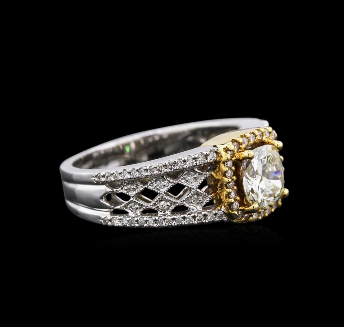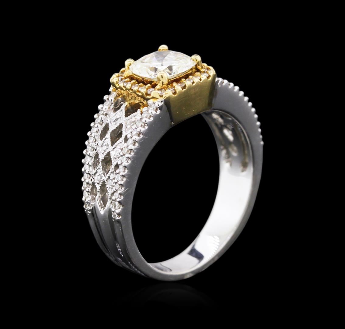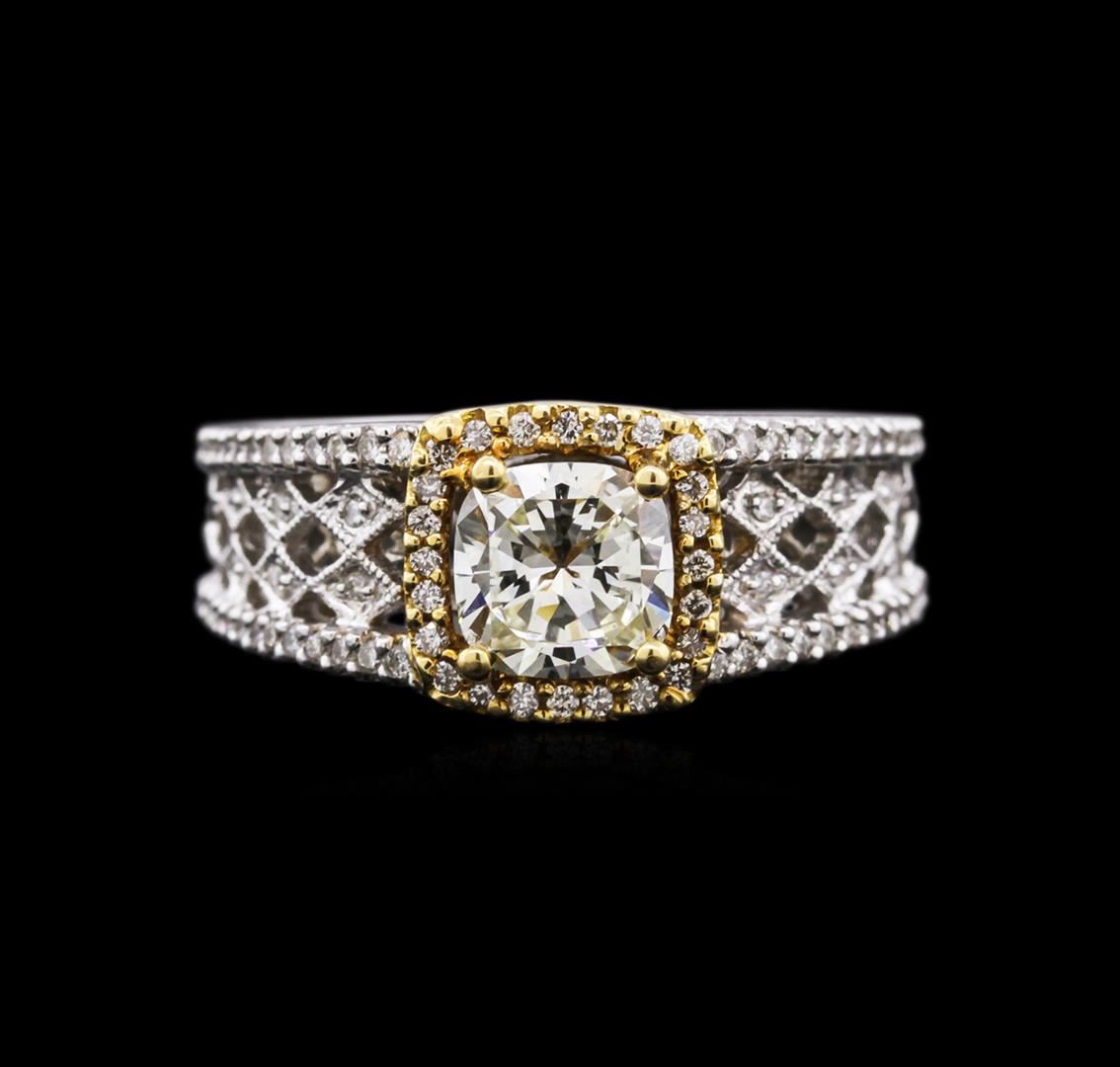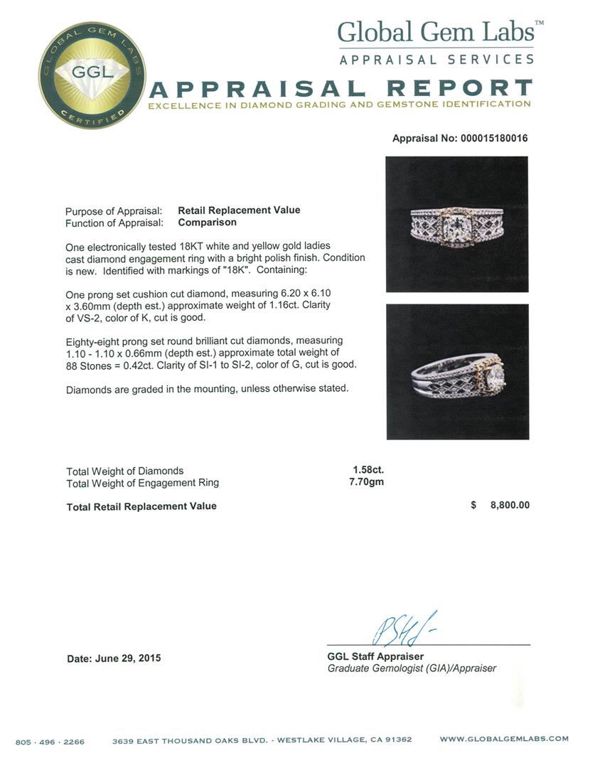 One electronically tested 18KT white and yellow gold ladies cast diamond engagement ring with a bright polish finish. Identified with markings of "18K". Condition is new. Containing: One prong set cushion cut diamond, measuring 6.20 x 6.10 x 3.60mm (depth est.) approximate weight of 1.16ct. Clarity: VS-2. Color: K, Cut is Good. Eighty-Eight prong set round brilliant cut diamonds, measuring 1.10 - 1.10 x 0.66mm (depth est.) approximate total weight of 88 Stones = 0.42ct. Clarity: SI-1 to SI-2. Color: G, Cut is Good. Diamonds are graded in the mounting, unless otherwise stated. Total Weight of Diamonds 1.58ct. Total Weight of Engagement Ring 7.70 grams. GGL Appraised at $8,800.00.