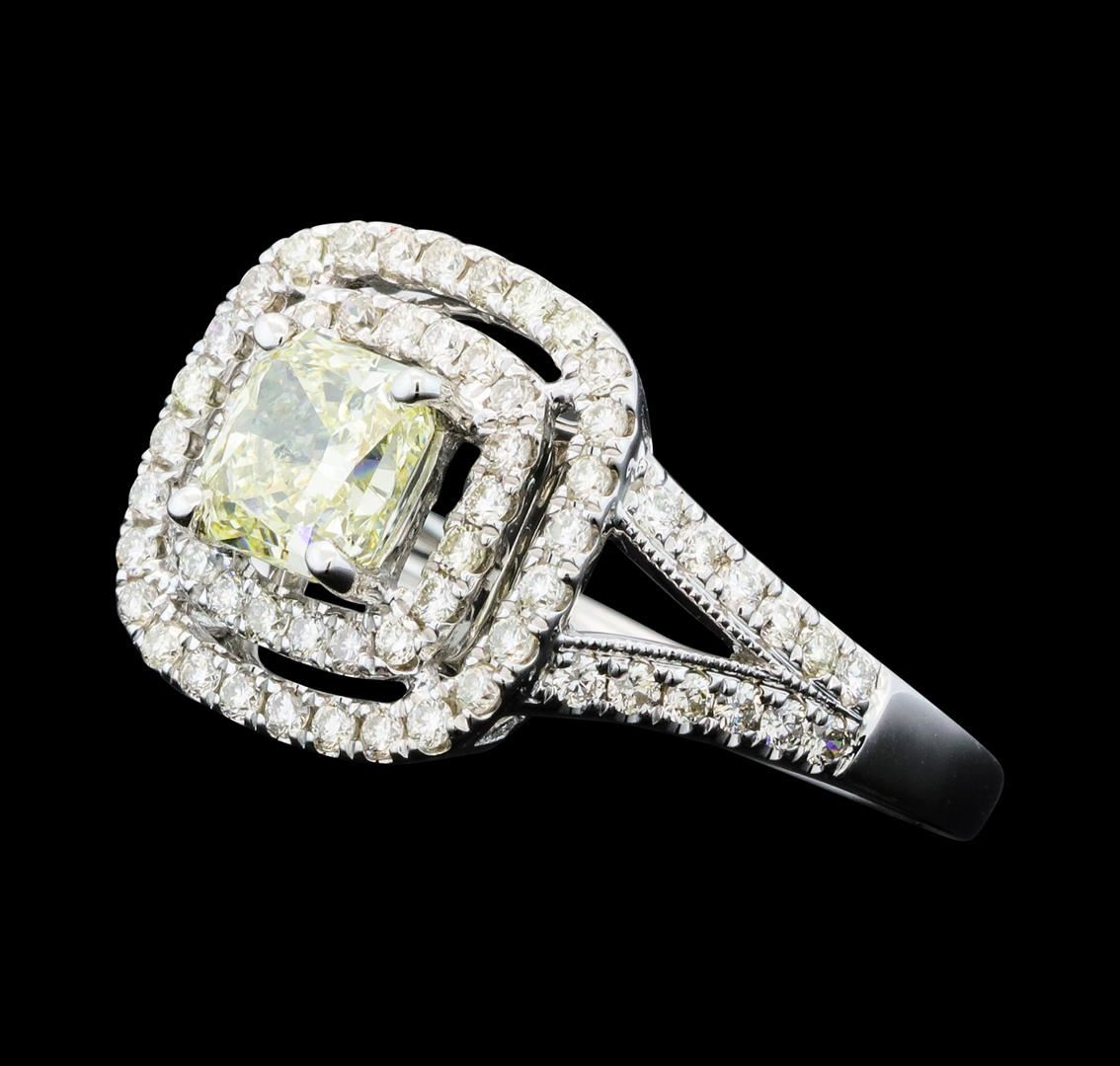 One electronically tested 14KT white gold lady's cast wedding ring with a split shank double halo with a bright polish with milgrain detailing finish. The featured lady's ring has a shank measuring 1.82 millimeters wide. Identified with markings of '14K'. Condition is new, good workmanship. Containing: One prong set cushion cut diamond, measuring 5.47 x 5.38 x 3.75mm (depth est.) , 10.00.%. GTCF approximate weight of 1.03ct. Graded in the setting. Clarity SI-3. Color: L - M Cut Very Good Seventy-Two prong set round brilliant cut diamonds, measuring 1.30 - 1.25 x 0.79mm (depth est.) approximate total weight of 72 Stones = 0.56ct. Graded in the setting. Clarity SI-1 to SI-2. Color: H - I Cut Very Good. Total Weight of Diamonds 1.59ct.. Total Weight of Ring 3.80gm. GAS Appraised at $8,670.00.