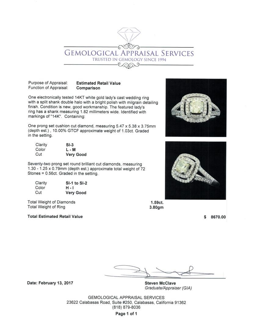 One electronically tested 14KT white gold lady's cast wedding ring with a split shank double halo with a bright polish with milgrain detailing finish. The featured lady's ring has a shank measuring 1.82 millimeters wide. Identified with markings of '14K'. Condition is new, good workmanship. Containing: One prong set cushion cut diamond, measuring 5.47 x 5.38 x 3.75mm (depth est.) , 10.00.%. GTCF approximate weight of 1.03ct. Graded in the setting. Clarity SI-3. Color: L - M Cut Very Good Seventy-Two prong set round brilliant cut diamonds, measuring 1.30 - 1.25 x 0.79mm (depth est.) approximate total weight of 72 Stones = 0.56ct. Graded in the setting. Clarity SI-1 to SI-2. Color: H - I Cut Very Good. Total Weight of Diamonds 1.59ct.. Total Weight of Ring 3.80gm. GAS Appraised at $8,670.00.