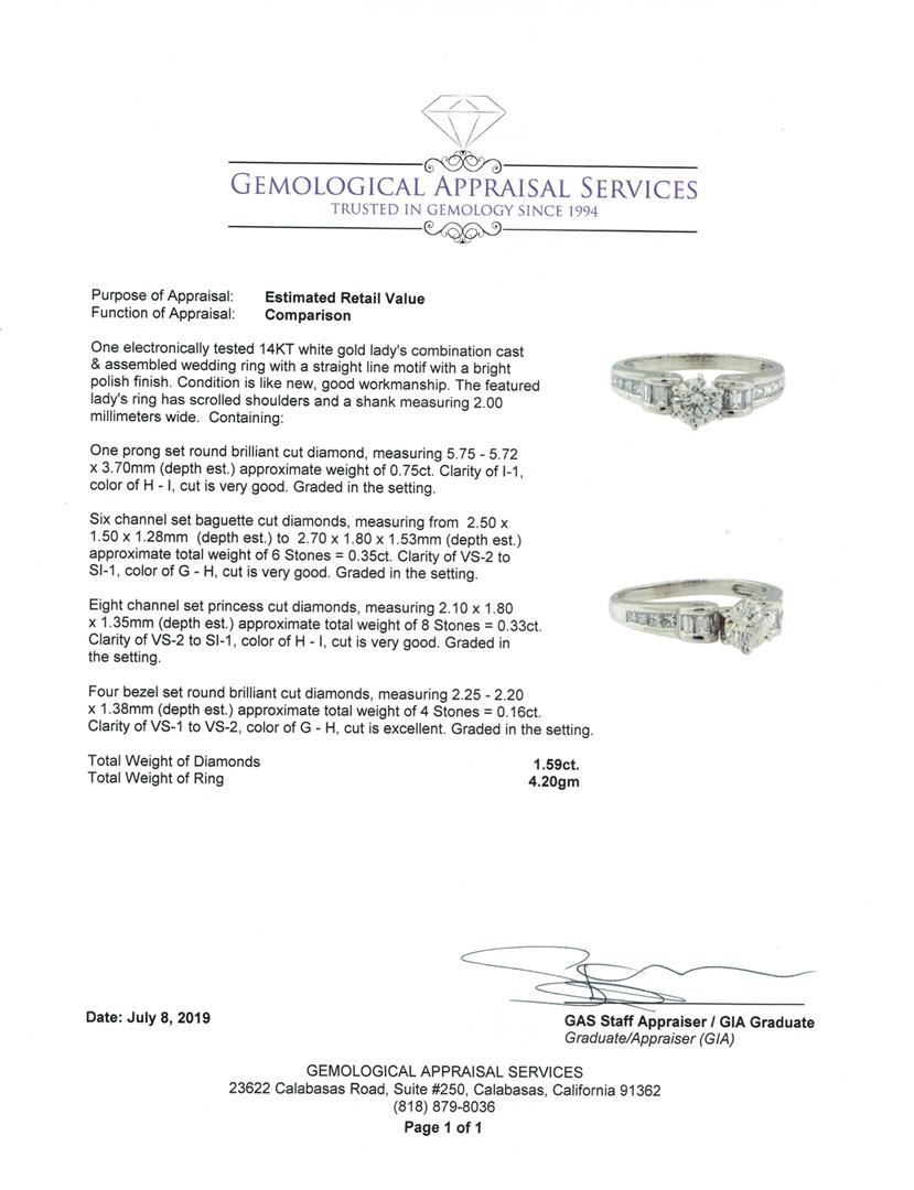 One electronically tested 14KT white gold lady's combination cast & assembled wedding ring with a straight line motif with a bright polish finish. The featured lady's ring has scrolled shoulders and a shank measuring 2.00 millimeters wide. Condition is like new, good workmanship. Containing: One prong set round brilliant cut diamond, measuring 5.75 - 5.72 x 3.70mm (depth est.) approximate weight of 0.75ct. Graded in the setting. Color H - I Clarity I-1 Cut Very Good Six channel set baguette cut diamonds, measuring from 2.50 x 1.50 x 1.28mm (depth est.) to 2.70 x 1.80 x 1.53mm (depth est.) approximate total weight of 6 Stones = 0.35ct. Graded in the setting. Color G - H Clarity VS-2 to SI-1 Cut Very Good Eight channel set princess cut diamonds, measuring 2.10 x 1.80 x 1.35mm (depth est.) approximate total weight of 8 Stones = 0.33ct. Graded in the setting. Color H - I Clarity VS-2 to SI-1 Cut Very Good Four bezel set round brilliant cut diamonds, measuring 2.25 - 2.20 x 1.38mm (depth est.) approximate total weight of 4 Stones = 0.16ct. Graded in the setting. Color G - H Clarity VS-1 to VS-2 Cut Excellent. Total Weight of Diamonds 1.59ct.. Total Weight of Ring 4.20gm GAS Appraised at $6945.00. GAS Appraised.