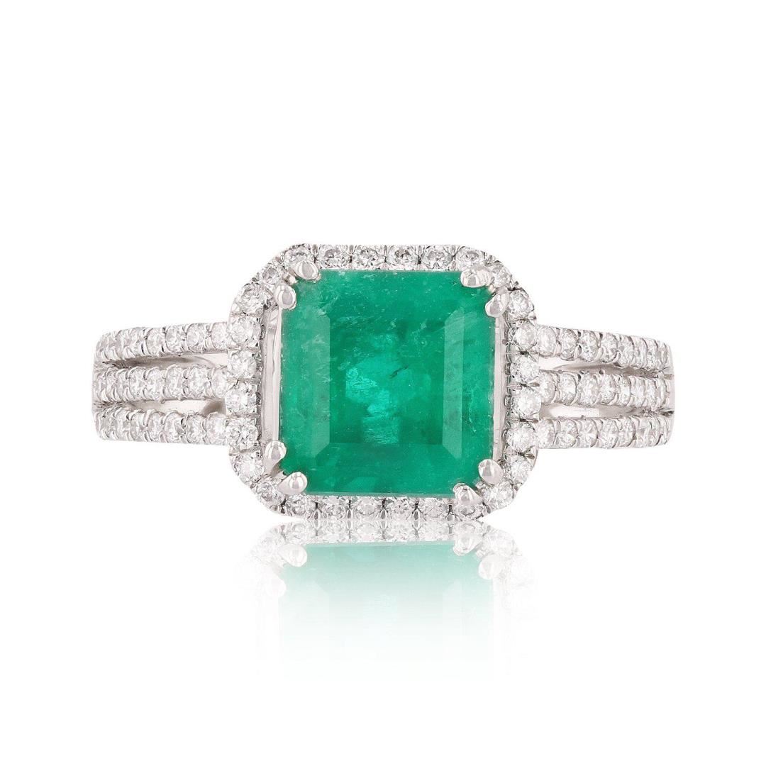 One electronically tested platinum ladies cast emerald and diamond ring with a bright polish finish. Condition is new, good workmanship. The featured emerald is set within a diamond bezel supported by diamond set three-way split shoulders, completed by a two millimeter wide band. Trademark is Orianne. Identified with markings of "PT950". Containing: One prong set square step cut natural emerald, measuring 7.60 x 7.00 x 4.10mm, approximate weight of 1.59ct., clarity is heavily included, type III, medium dark, moderately strong, very slightly bluish green color, (GIA vslbG 6/4), cut is good. Transmitting light with a minimum of distortion, transparent. Naturally occurring internal and external characteristics are present. Indications of oil residue. Graded in the setting. Seventy-six prong set round brilliant cut diamonds approximate total weight of 76 Stones = 0.39ct. Graded in the setting. Clarity VS-2 to SI-1 Color F - H Total Weight-of-Colored Stones 1.59ct. Total Weight of Diamonds 0.39ct. Total Weight of Ring 5.18gm #Size: 7