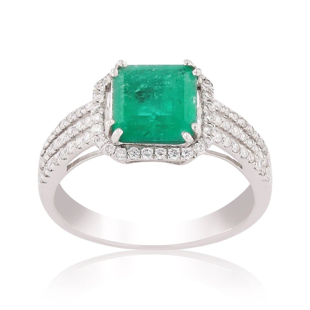One electronically tested platinum ladies cast emerald and diamond ring with a bright polish finish. Condition is new, good workmanship. The featured emerald is set within a diamond bezel supported by diamond set three-way split shoulders, completed by a two millimeter wide band. Trademark is Orianne. Identified with markings of "PT950". Containing: One prong set square step cut natural emerald, measuring 7.60 x 7.00 x 4.10mm, approximate weight of 1.59ct., clarity is heavily included, type III, medium dark, moderately strong, very slightly bluish green color, (GIA vslbG 6/4), cut is good. Transmitting light with a minimum of distortion, transparent. Naturally occurring internal and external characteristics are present. Indications of oil residue. Graded in the setting. Seventy-six prong set round brilliant cut diamonds approximate total weight of 76 Stones = 0.39ct. Graded in the setting. Clarity VS-2 to SI-1 Color F - H Total Weight-of-Colored Stones 1.59ct. Total Weight of Diamonds 0.39ct. Total Weight of Ring 5.18gm #Size: 7