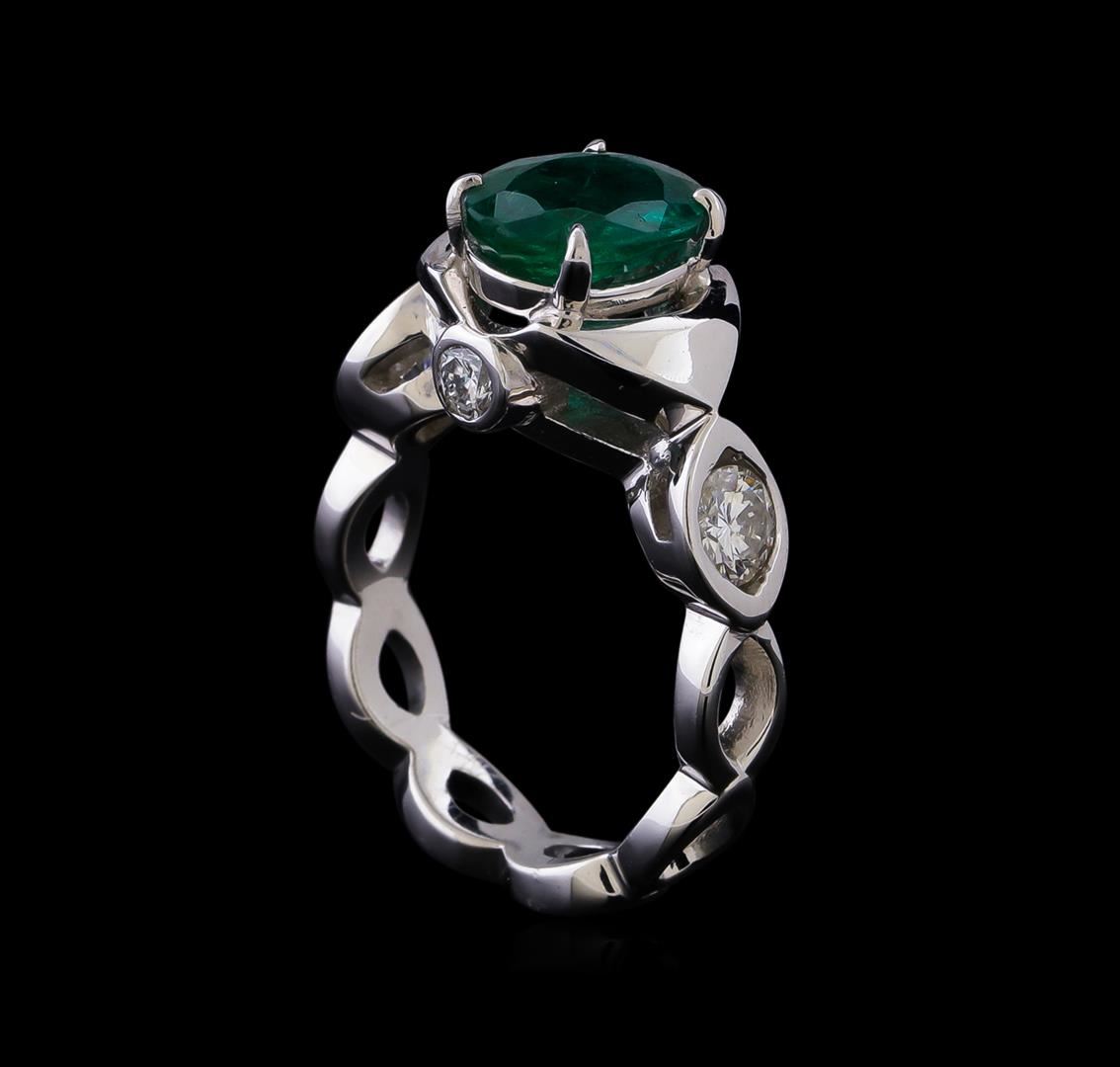 One 14K white gold lady's ring. 7.62 gr. Containing: 1 - one center oval cut natural emerald. 1.59 CTS TW. 2 - 0.33 CTS TW round cut diamonds. All SI clarity, G-H color. Fine Cutting and proportions.