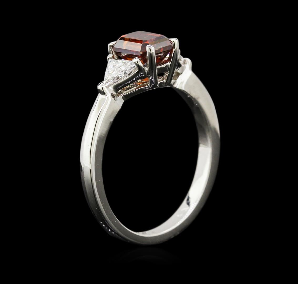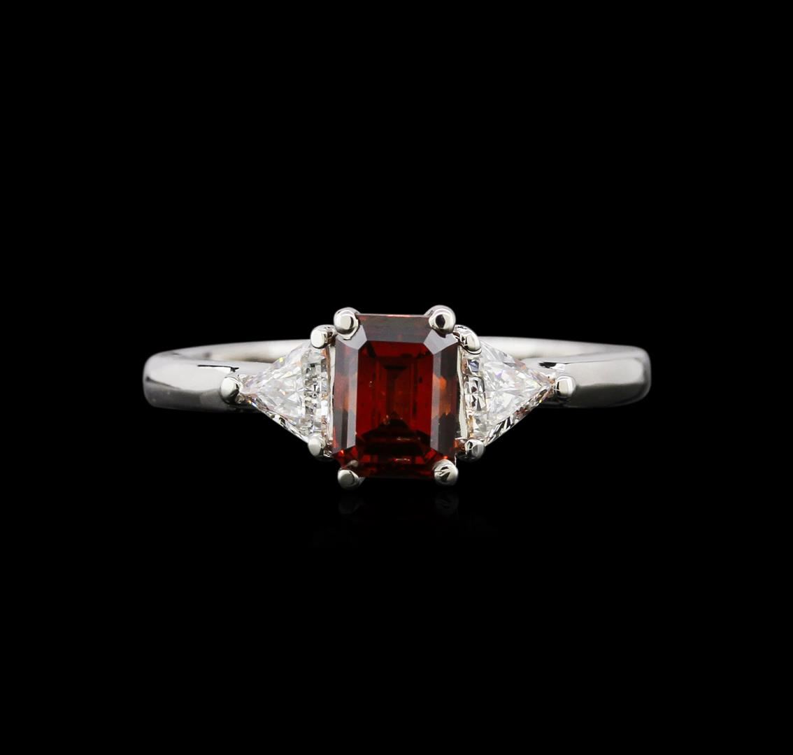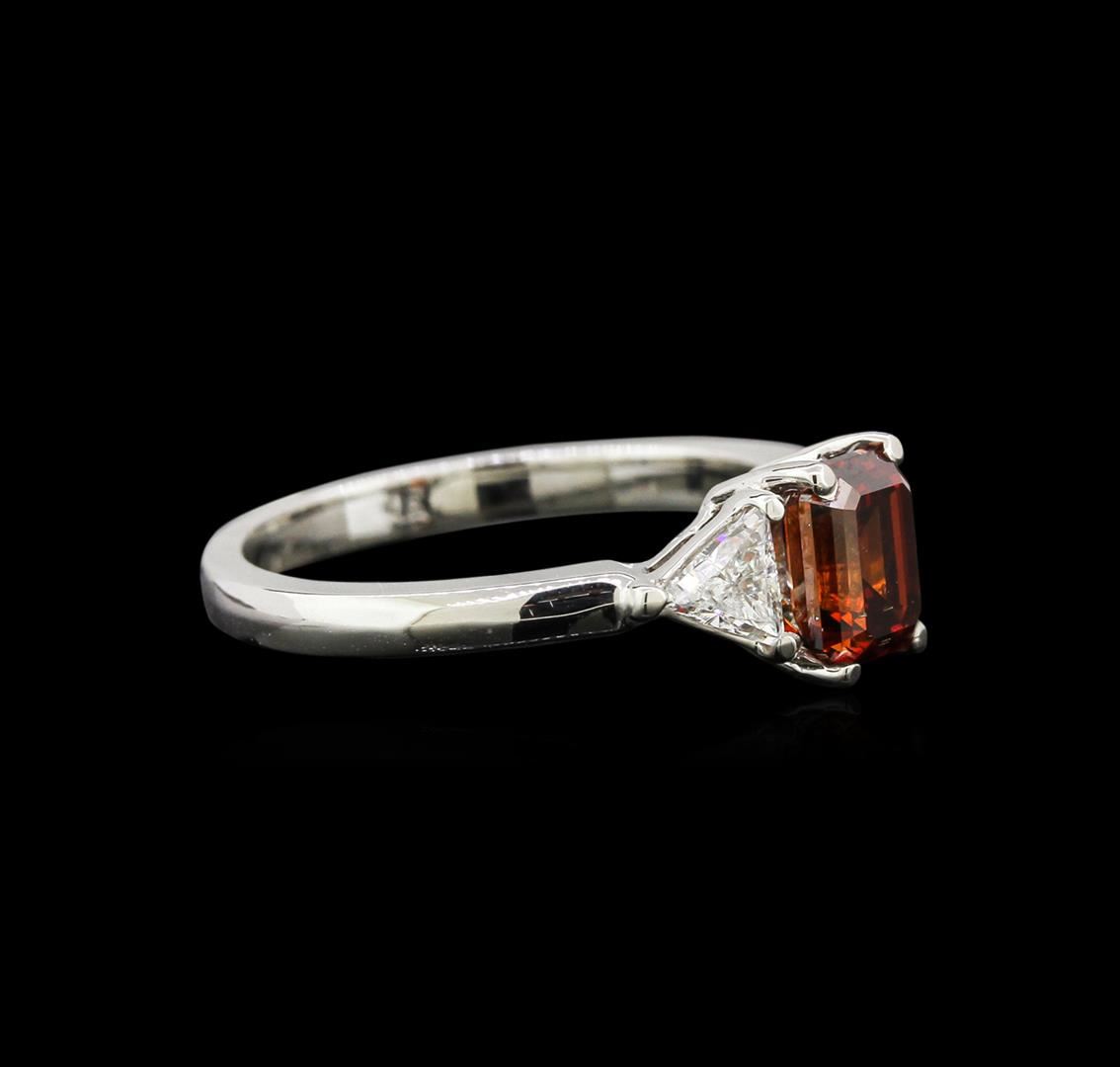 One electronically tested 14KT white gold lady's cast 3-stone ring with a bright polish finish. The featured lady's ring has a shank measuring 2.10 millimeters wide. Identified with markings of "14K". Condition is new, good workmanship. Containing: Two prong set triangle brilliant cut diamonds, measuring 4.40 x 4.20 x 1.90mm (depth est.) approximate total weight of 2 Stones = 0.39ct. Graded in the setting. Clarity: SI-2. Color: F - Good One prong set emerald cut diamond, measuring 6.39 x 4.80 x 3.96mm (depth est.) , 5.00.%. GTCF approximate weight of 1.20ct. Colored gemstones are presumed to have been subjected to commonly used enhancement processes. Graded in the setting. Clarity: SI-1 Cut Very Good. Total Weight of Diamonds 1.59ct. Total Weight of Ring 3.40gm. GAS Appraised at $8,785.00.