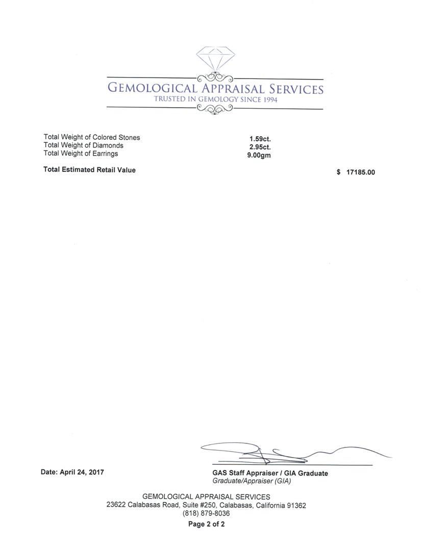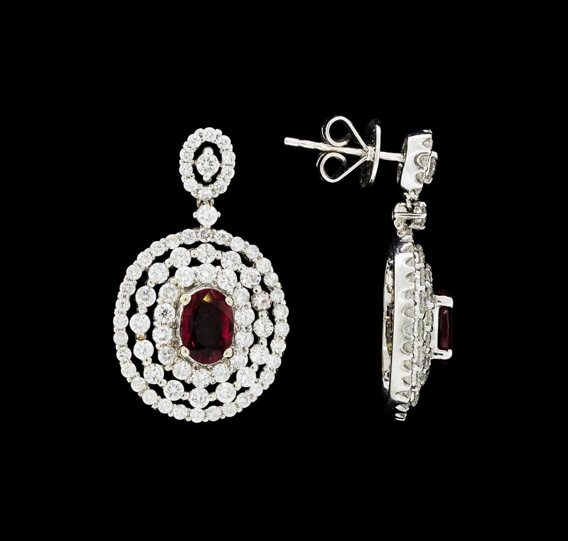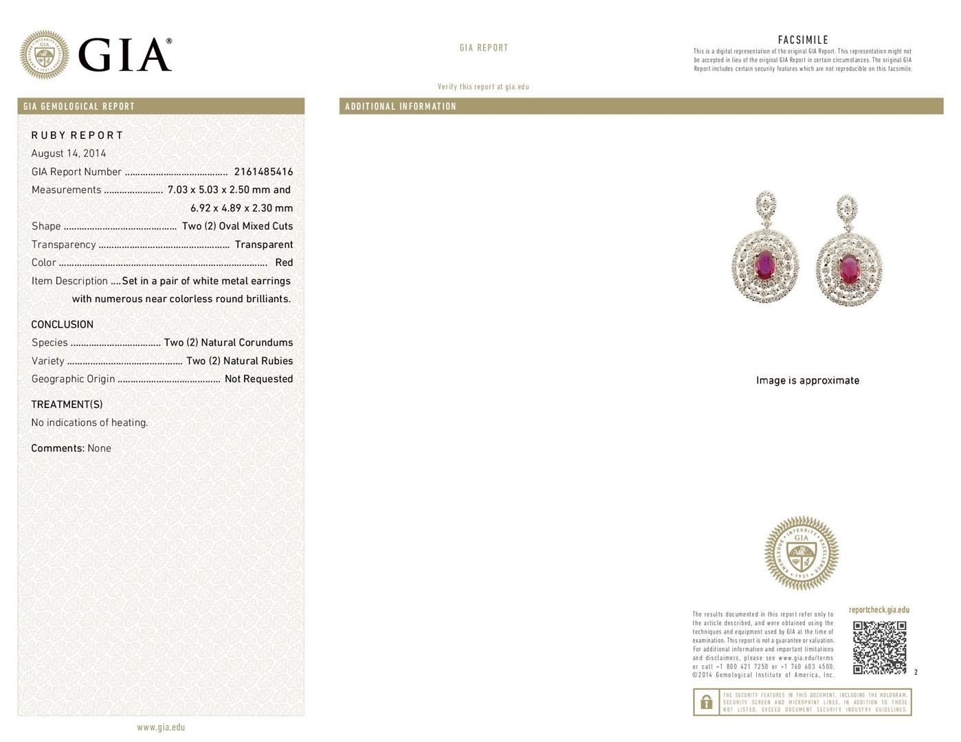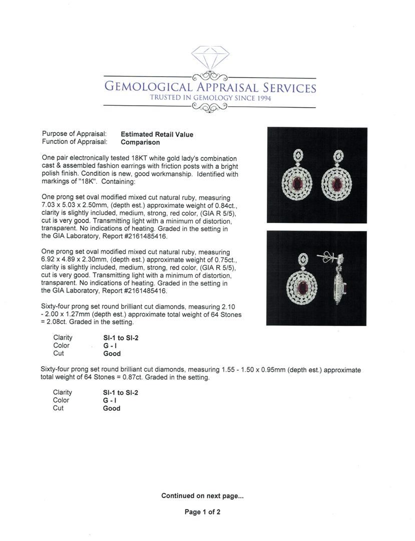 One pair electronically tested 18KT white gold lady's combination cast & assembled fashion earrings with friction posts with a bright polish finish. Identified with markings of '18K'. Condition is new, good workmanship. Containing: One prong set oval modified mixed cut natural ruby, measuring 7.03 x 5.03 x 2.50mm, (depth est.) approximate weight of 0.84ct., clarity is slightly included, medium, strong, red color, (GIA R 5/5), cut is very good. Transmitting light with a minimum of distortion, transparent. No indications of heating. Graded in the setting in the GIA Laboratory, Report #2161485416. One prong set oval modified mixed cut natural ruby, measuring 6.92 x 4.89 x 2.30mm, (depth est.) approximate weight of 0.75ct., clarity is slightly included, medium, strong, red color, (GIA R 5/5), cut is very good. Transmitting light with a minimum of distortion, transparent. No indications of heating. Graded in the setting in the GIA Laboratory, Report #2161485416. Sixty-Four prong set round brilliant cut diamonds, measuring 2.10 - 2.00 x 1.27mm (depth est.) approximate total weight of 64 Stones = 2.08ct. Graded in the setting. Color G - I Clarity SI-1 to SI-2 Cut Good Sixty-Four prong set round brilliant cut diamonds, measuring 1.55 - 1.50 x 0.95mm (depth est.) approximate total weight of 64 Stones = 0.87ct. Graded in the setting. Color G - I Clarity SI-1 to SI-2 Cut Good. Total Weight of Colored Stones 1.59ct.. Total Weight of Diamonds 2.95ct.. Total Weight of Earrings 9.00gm GAS Appraised at $17185.00. GAS Appraised at $17,185.00.