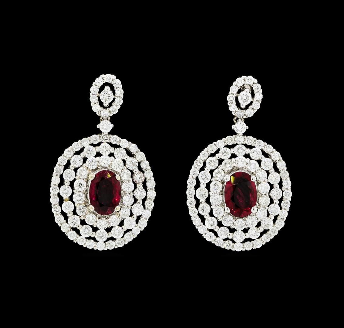 One pair electronically tested 18KT white gold lady's combination cast & assembled fashion earrings with friction posts with a bright polish finish. Identified with markings of '18K'. Condition is new, good workmanship. Containing: One prong set oval modified mixed cut natural ruby, measuring 7.03 x 5.03 x 2.50mm, (depth est.) approximate weight of 0.84ct., clarity is slightly included, medium, strong, red color, (GIA R 5/5), cut is very good. Transmitting light with a minimum of distortion, transparent. No indications of heating. Graded in the setting in the GIA Laboratory, Report #2161485416. One prong set oval modified mixed cut natural ruby, measuring 6.92 x 4.89 x 2.30mm, (depth est.) approximate weight of 0.75ct., clarity is slightly included, medium, strong, red color, (GIA R 5/5), cut is very good. Transmitting light with a minimum of distortion, transparent. No indications of heating. Graded in the setting in the GIA Laboratory, Report #2161485416. Sixty-Four prong set round brilliant cut diamonds, measuring 2.10 - 2.00 x 1.27mm (depth est.) approximate total weight of 64 Stones = 2.08ct. Graded in the setting. Color G - I Clarity SI-1 to SI-2 Cut Good Sixty-Four prong set round brilliant cut diamonds, measuring 1.55 - 1.50 x 0.95mm (depth est.) approximate total weight of 64 Stones = 0.87ct. Graded in the setting. Color G - I Clarity SI-1 to SI-2 Cut Good. Total Weight of Colored Stones 1.59ct.. Total Weight of Diamonds 2.95ct.. Total Weight of Earrings 9.00gm GAS Appraised at $17185.00. GAS Appraised at $17,185.00.