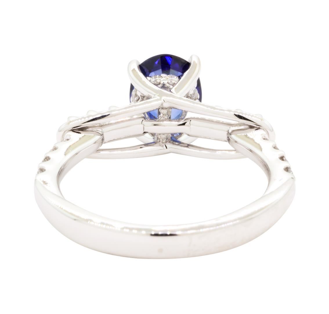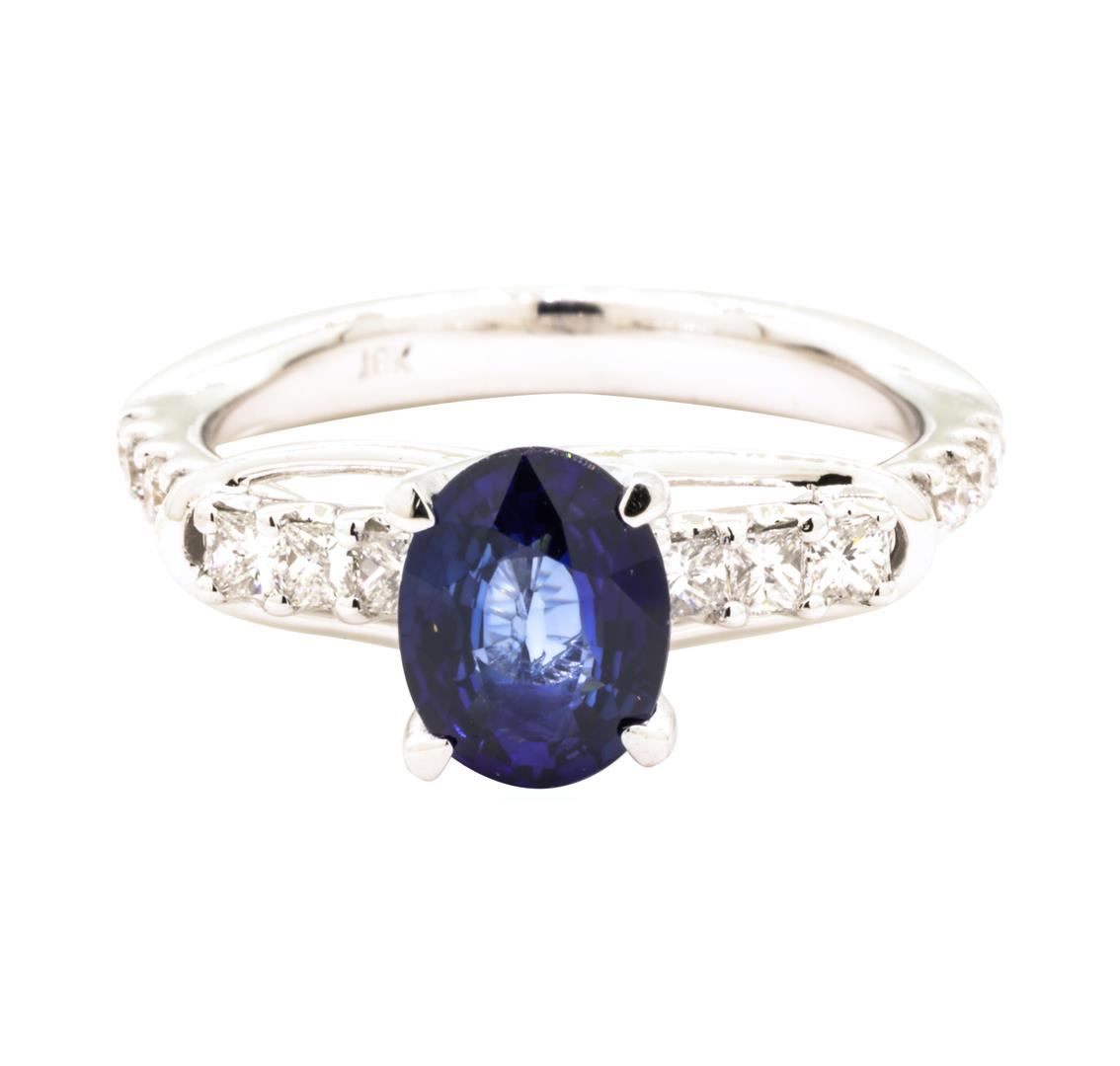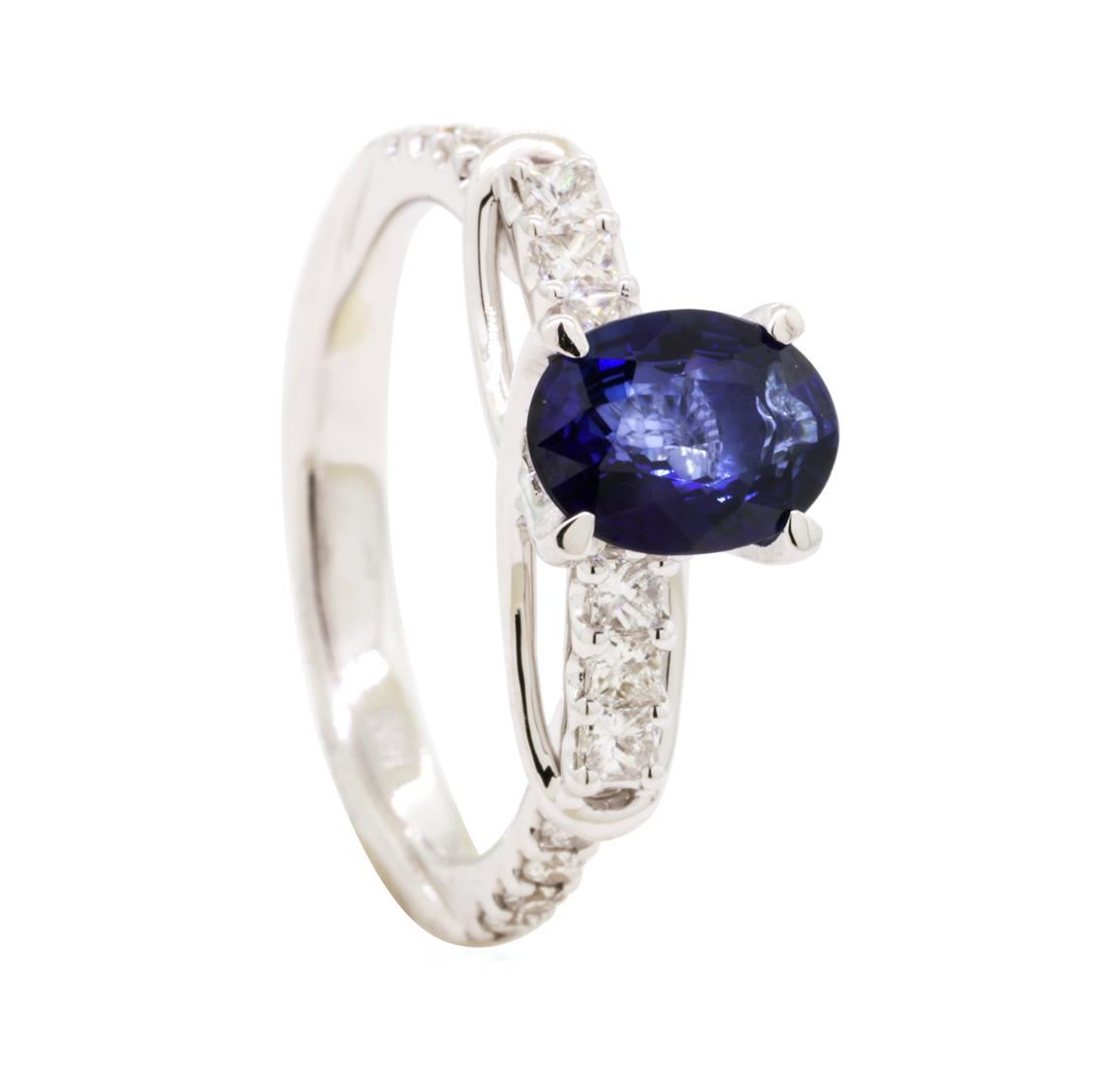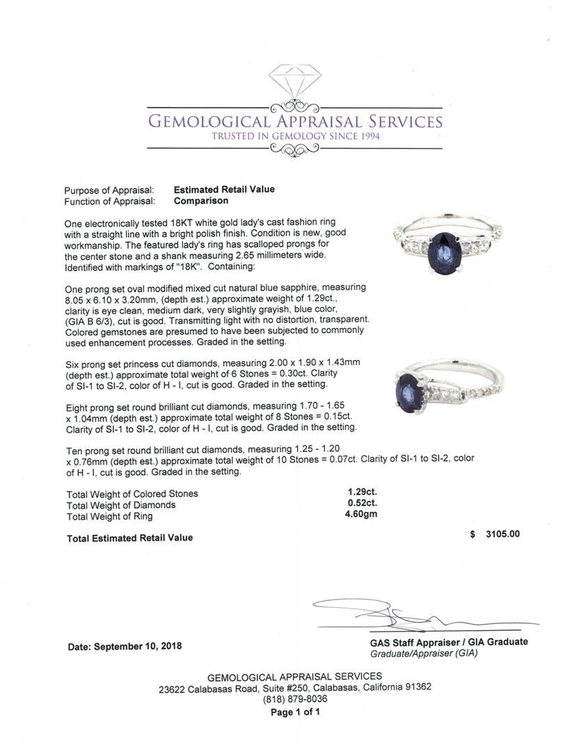 One electronically tested 18KT white gold lady's cast fashion ring with a straight line with a bright polish finish. The featured lady's ring has scalloped prongs for the center stone and a shank measuring 2.65 millimeters wide. Identified with markings of '18K'. Condition is new, good workmanship. Containing: One prong set oval modified mixed cut natural blue sapphire, measuring 8.05 x 6.10 x 3.20mm, (depth est.) approximate weight of 1.29ct., clarity is eye clean, medium dark, very slightly grayish, blue color, (GIA B 6/3), cut is good. Transmitting light with no distortion, transparent. Colored gemstones are presumed to have been subjected to commonly used enhancement processes. Graded in the setting. Six prong set princess cut diamonds, measuring 2.00 x 1.90 x 1.43mm (depth est.) approximate total weight of 6 Stones = 0.30ct. Graded in the setting. Color H - I Clarity SI-1 to SI-2 Cut Good Eight prong set round brilliant cut diamonds, measuring 1.70 - 1.65 x 1.04mm (depth est.) approximate total weight of 8 Stones = 0.15ct. Graded in the setting. Color H - I Clarity SI-1 to SI-2 Cut Good Ten prong set round brilliant cut diamonds, measuring 1.25 - 1.20 x 0.76mm (depth est.) approximate total weight of 10 Stones = 0.07ct. Graded in the setting. Color H - I Clarity SI-1 to SI-2 Cut Good. Total Weight of Colored Stones 1.29ct.. Total Weight of Diamonds 0.52ct.. Total Weight of Ring 4.60gm GAS Appraised at $3105.00. GAS Appraised at $3,105.00.