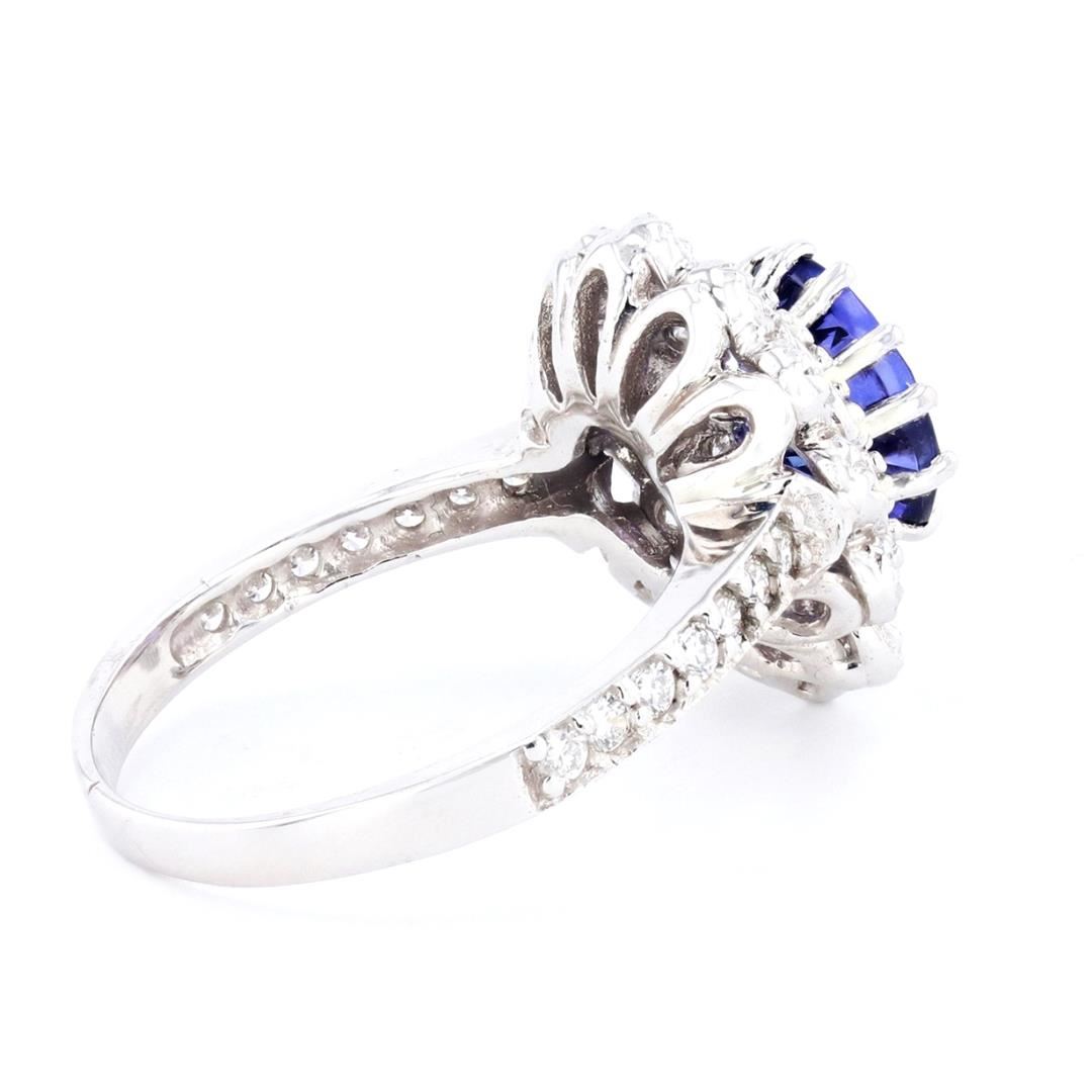 1.59ct Tanzanite and 0.47ctw Diamond 14K White Gold Ring. Please see Photos and Description for all available information. This elegant 14K white gold ring is a dainty piece made to perfection. The 1.59ct tanzanite gemstone is the center gem and is surrounded by 0.47ctw diamonds. The tanzanite gemstone is a deep blue, semi-precious stone that is the national gemstone of Tanzania. The 14K white gold band is decorated with round diamonds and the ring is available in a size 7 1/2.