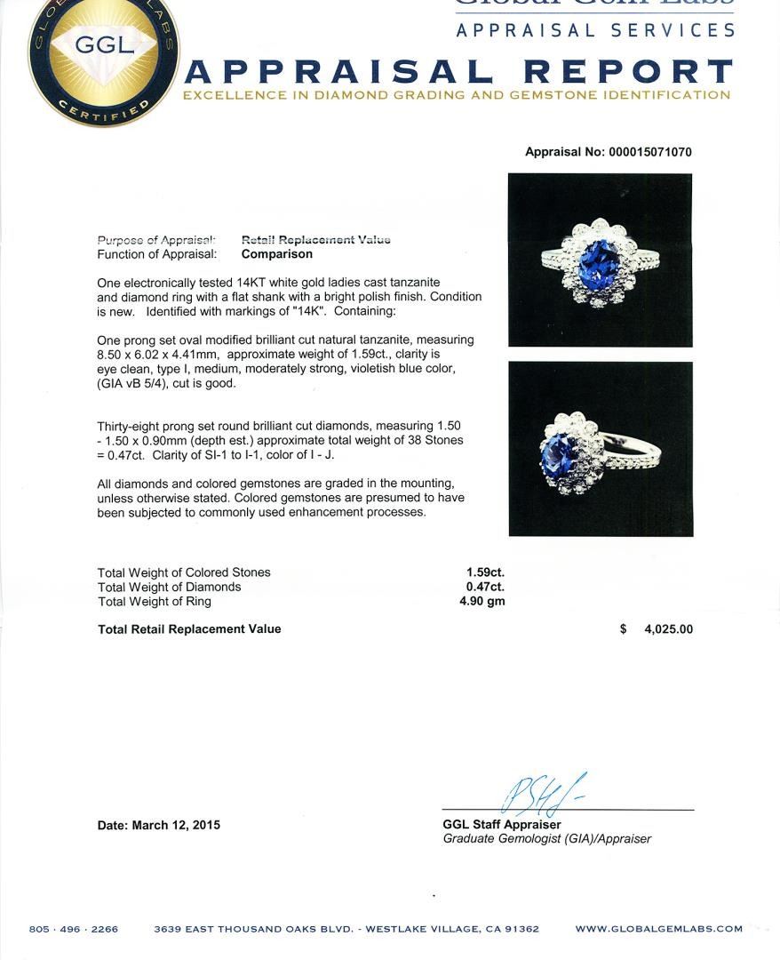 One electronically tested 14KT white gold ladies cast tanzanite and diamond ring with a flat shank with a bright polish finish. Condition is new. Identified with markings of "14K".; One prong set oval modified brilliant cut natural tanzanite, measuring 8.50 x 6.02 x 4.41mm, approximate weight of 1.59ct., clarity is eye clean, type I, medium, moderately strong, violetish blue color, (GIA vB 5/4), cut is good.; Thirty-eight prong set round brilliant cut diamonds, measuring 1.50 - 1.50 x 0.90mm (depth est.) approximate total weight of 38 Stones = 0.47ct. Clarity of SI-1 to I-1, color of I - J.; All diamonds and colored gemstones are graded in the mounting, unless otherwise stated. Colored gemstones are presumed to have been subjected to commonly used enhancement processes.; Total Weight of Colored Stones: 1.59ct.; Total Weight of Diamonds: 0.47ct.; Total Weight of Ring: 4.90 gm #Size: 7