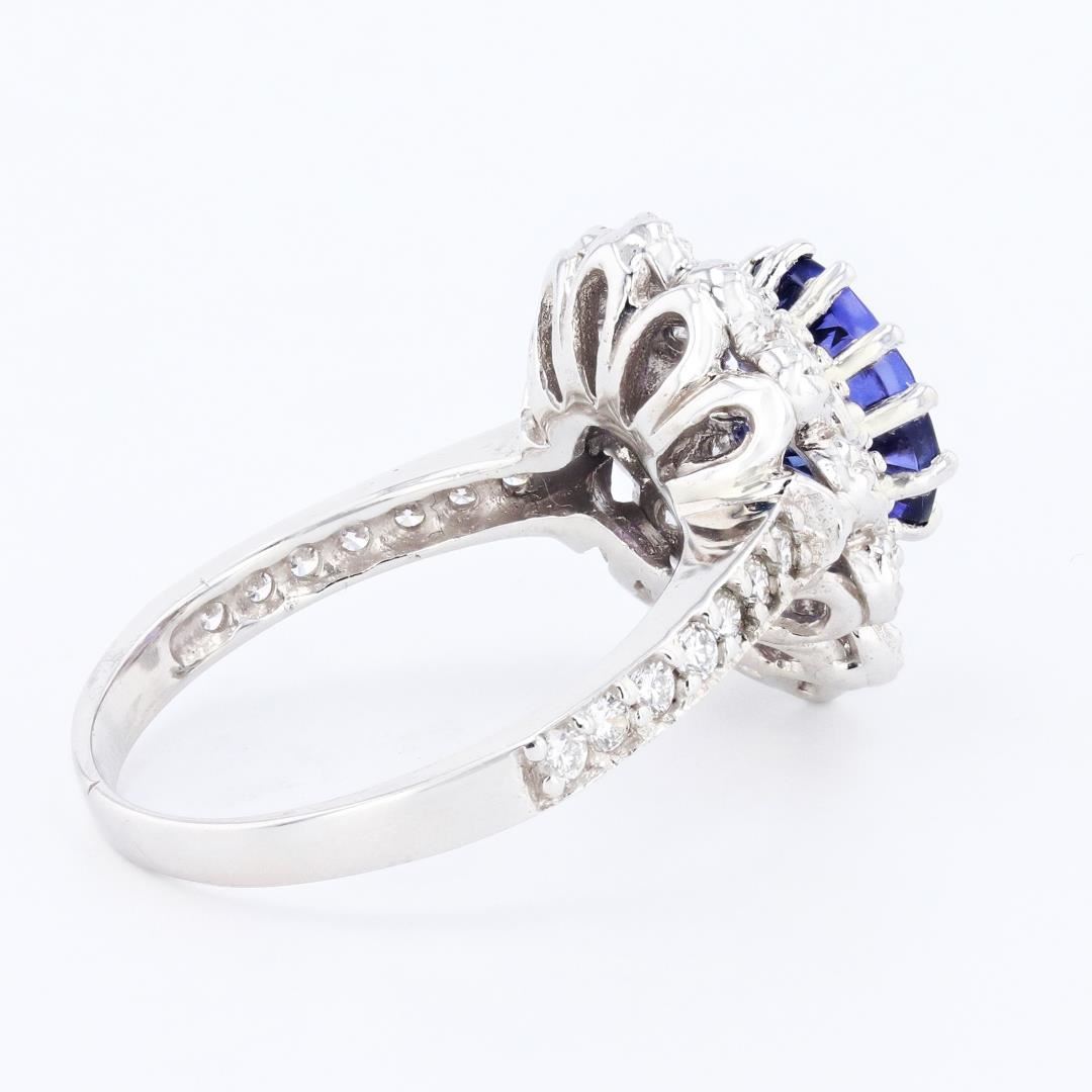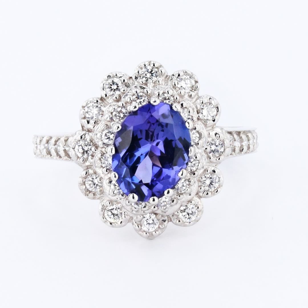 One electronically tested 14KT white gold ladies cast tanzanite and diamond ring with a flat shank with a bright polish finish. Condition is new. Identified with markings of "14K".; One prong set oval modified brilliant cut natural tanzanite, measuring 8.50 x 6.02 x 4.41mm, approximate weight of 1.59ct., clarity is eye clean, type I, medium, moderately strong, violetish blue color, (GIA vB 5/4), cut is good.; Thirty-eight prong set round brilliant cut diamonds, measuring 1.50 - 1.50 x 0.90mm (depth est.) approximate total weight of 38 Stones = 0.47ct. Clarity of SI-1 to I-1, color of I - J.; All diamonds and colored gemstones are graded in the mounting, unless otherwise stated. Colored gemstones are presumed to have been subjected to commonly used enhancement processes.; Total Weight of Colored Stones: 1.59ct.; Total Weight of Diamonds: 0.47ct.; Total Weight of Ring: 4.90 gm #Size: 7