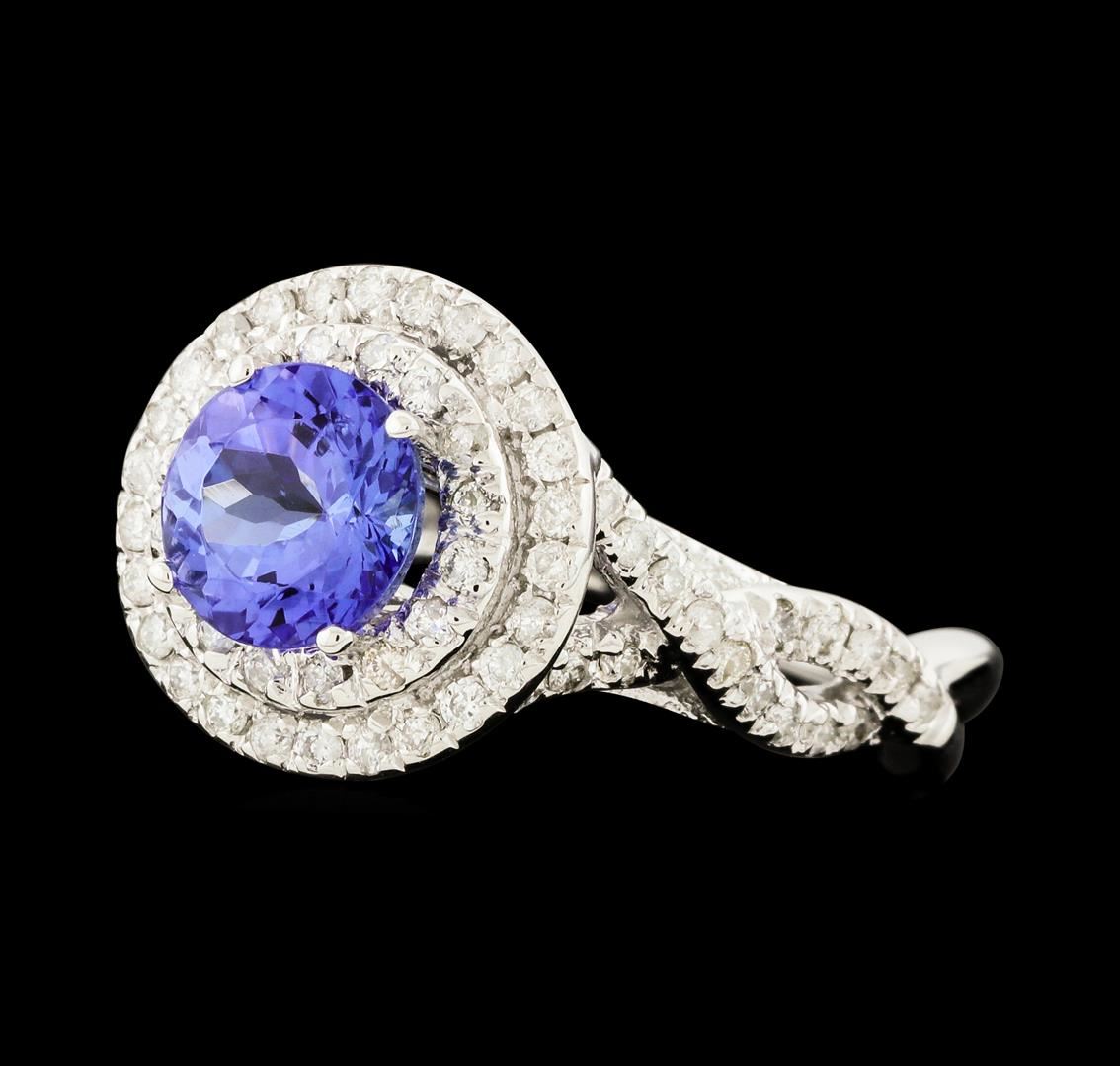 One electronically tested 14KT white gold lady's cast fashion ring with a crossover split shank with a halo with a bright polish with milgrain detailing finish. The featured lady's ring has a shank measuring 2.00 millimeters wide. Identified with markings of '14K'. Condition is new, good workmanship. Containing: One prong set round modified brilliant cut natural tanzanite, measuring 7.08 - 7.06 x 4.77 mm, (depth est.) approximate weight of 1.59ct., clarity is eye clean, medium, moderately strong, bluish violet color, (GIA bV 5/4), cut is very good. Transmitting light with no distortion, transparent. Colored gemstones are presumed to have been subjected to commonly used enhancement processes. Graded in the setting. Two prong set round brilliant cut diamonds, measuring 1.70 - 1.65 x 1.04mm (depth est.) approximate total weight of 2 Stones = 0.04ct. Graded in the setting. Clarity VS-2 to SI-1. Color: G - H Cut Very Good Seventy-Six prong set round brilliant cut diamonds, measuring 1.35 - 1.25 x 0.81mm (depth est.) approximate total weight of 76 Stones = 0.62ct. Graded in the setting. Clarity SI-2 to I-1. Color: G - I Cut Good. Total Weight of Colored Stones 1.59ct.. Total Weight of Diamonds 0.66ct.. Total Weight of Ring 5.50gm. GAS Appraised at $4,230.00.