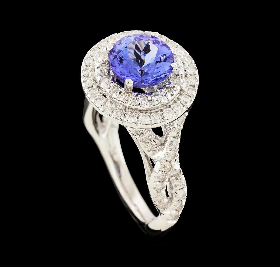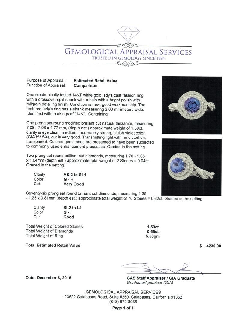 One electronically tested 14KT white gold lady's cast fashion ring with a crossover split shank with a halo with a bright polish with milgrain detailing finish. The featured lady's ring has a shank measuring 2.00 millimeters wide. Identified with markings