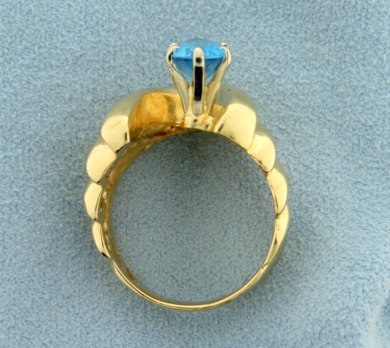 In 14k yellow gold. Contains a pear shaped blue topaz with bright blue color and excellent clarity. Size 7 1/2. 8.1g.